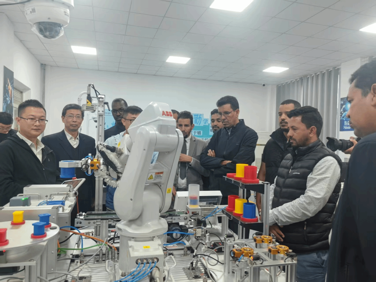 2025 年 11 月 14 日,毛里塔尼亚职业教育宏观政策研修班一行 20 余人,走进 “工业机器人与数字化制造” 专精特新产业学院,以 “实地考察 + 专题研讨” 的形式,深入探寻中国职业教育在产教融合、数字化人才培养领域的实践经验,为毛里塔尼亚职业教育体系建设与产业适配发展汲取参考样本。