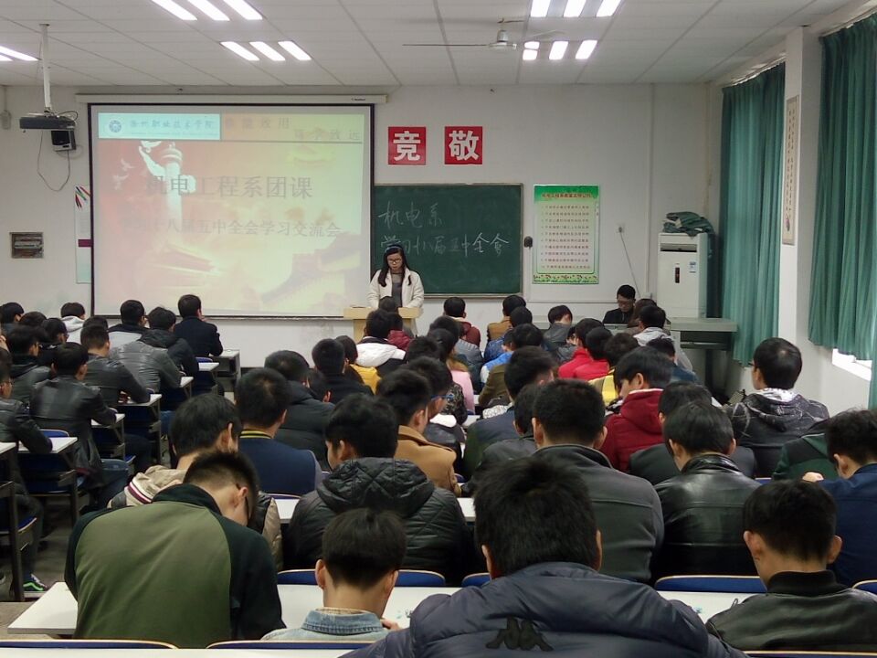 2015年11月23日,机电系团总支在5103教室召开十八届五中全会精神专题学习交流会。此次会议由团总支副书记张宏影主持,机电系团总支、学生会、社团、各班团支部学生干部参加本次会议。