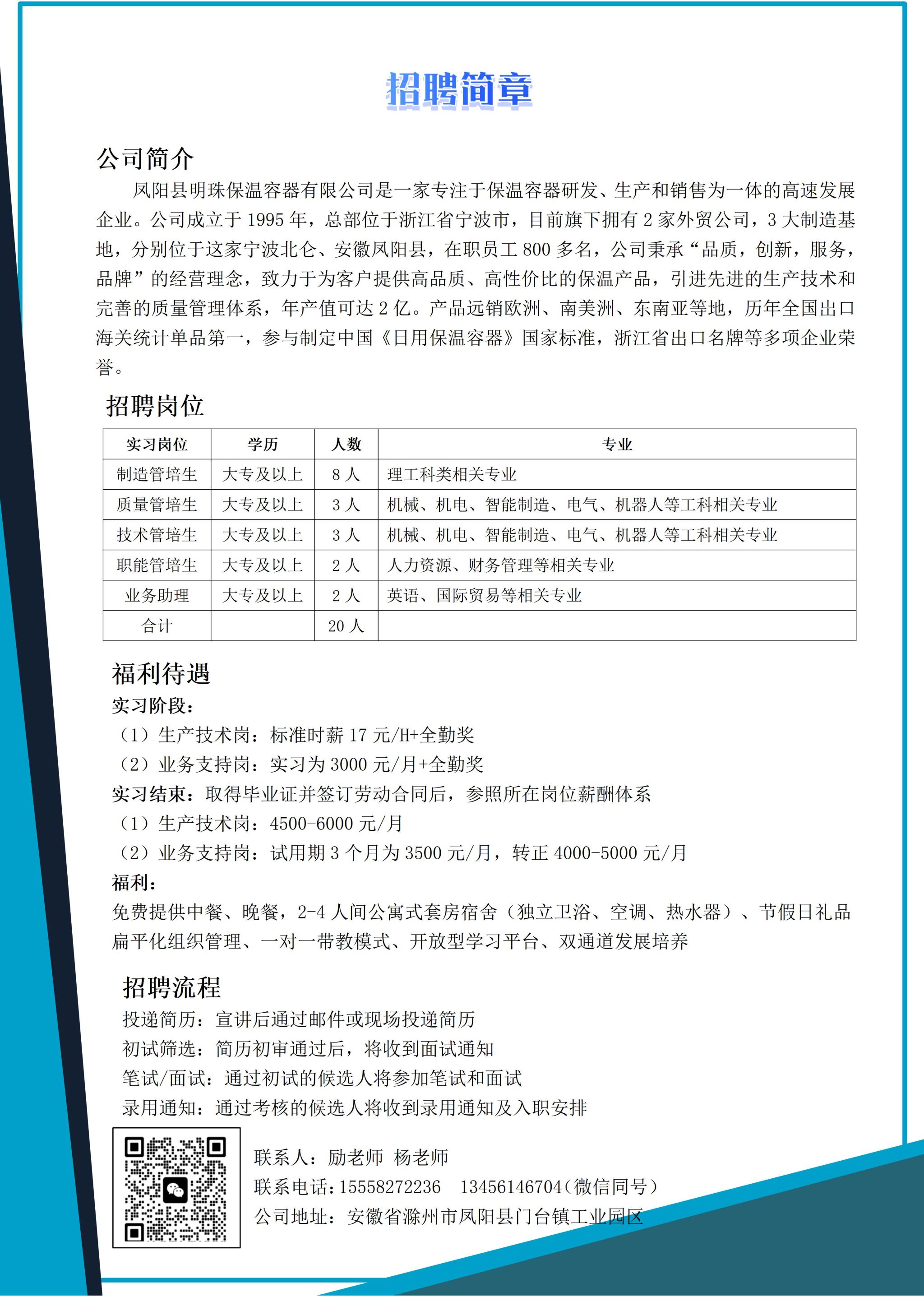 【招聘信息发布】凤阳县明珠保温容器有限公司