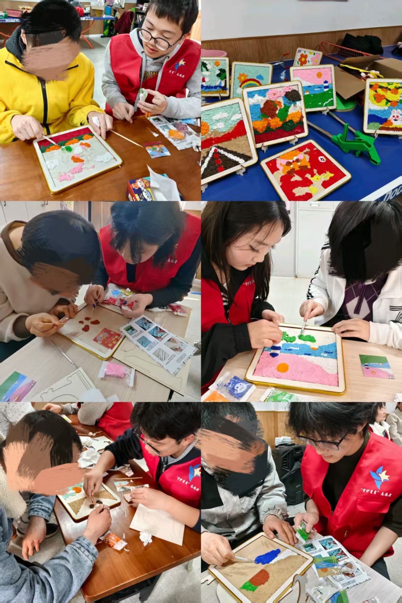 随后开展的纸浆画创作活动,志愿者们提前将彩色纸浆、画框等材料摆放整齐,先为孩子们简单演示,再鼓励孩子们按照自己的喜好挑选色彩、自由创作。过程中,志愿者们全程悉心守护,尊重每一位孩子的创作想法,对于动手能力稍弱的孩子,志愿者便耐心协助铺浆;对于专注创作的孩子,志愿者则静静陪伴,适时递上所需材料。没有刻板的要求,只有自由的表达与暖心的陪伴,孩子们用彩色纸浆在画纸上勾勒出属于自己的童真世界,一幅幅色彩斑斓、独具童趣的纸浆画渐渐呈现。每一幅作品都藏着孩子们独特的内心想法,也见证着志愿者与孩子们之间慢慢建立的信任与默契,互动间的温暖点滴,成为活动中最动人的风景。