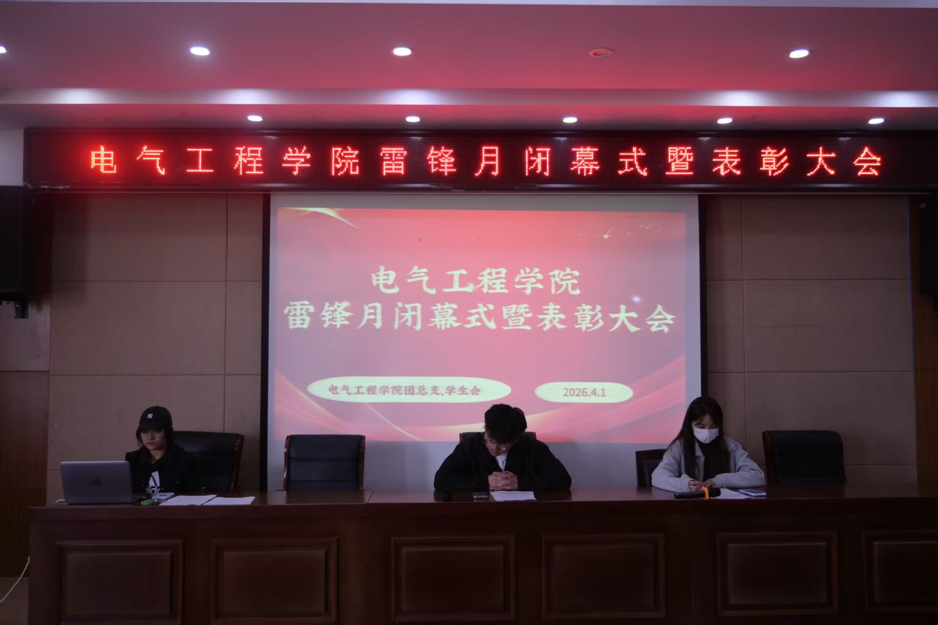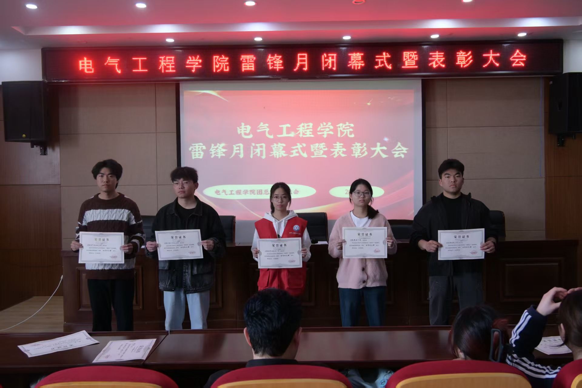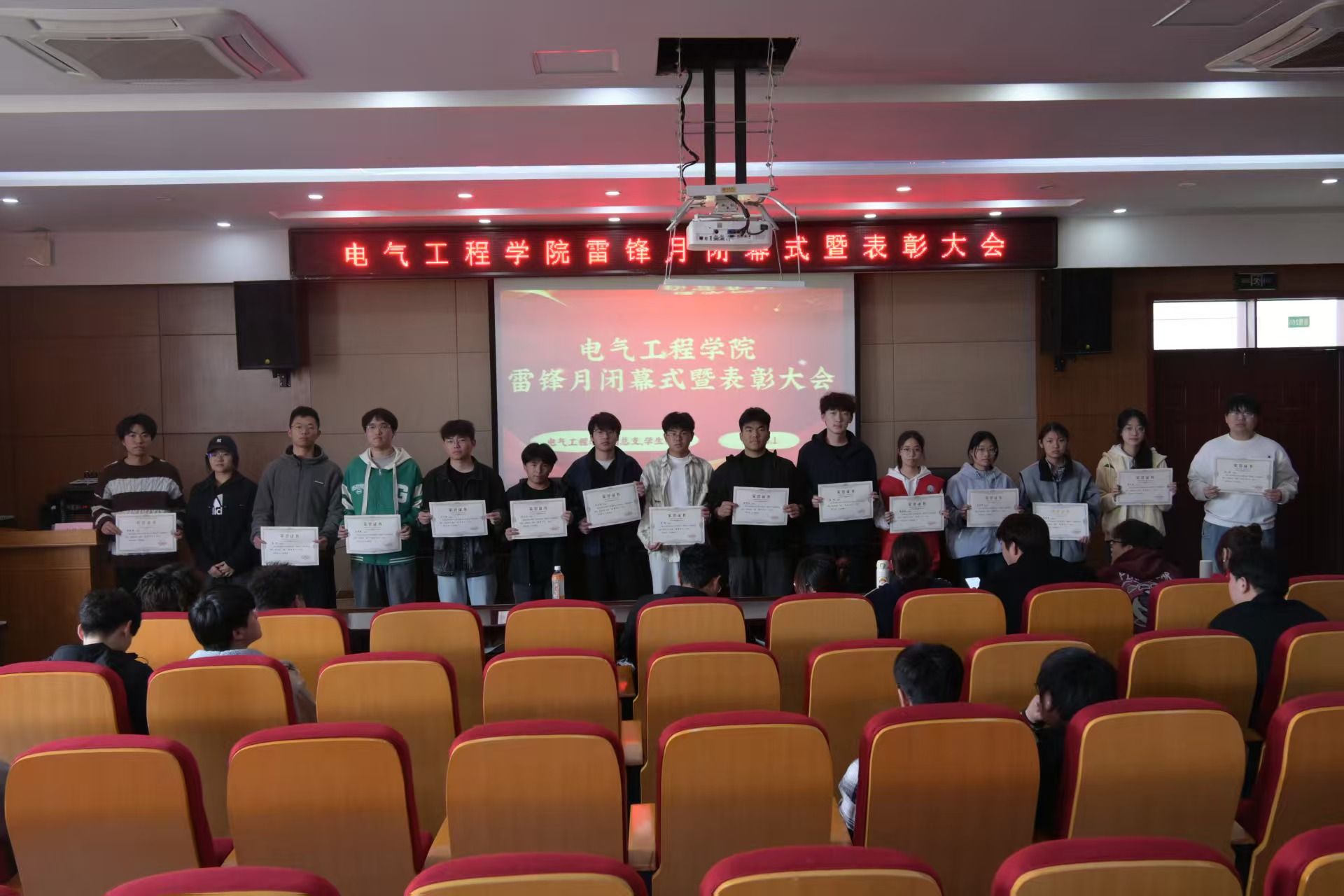 最后,主持人贾邦国宣布电气工程学院雷锋月闭幕式暨表彰大会圆满结束。此次大会不仅为雷锋月系列活动画上圆满句号,更激励着全体电气学子以雷锋精神为指引,立足新时代、展现新作为,用青春力量书写奉献篇章,为构建和谐校园、服务社会发展贡献青年智慧与力量。