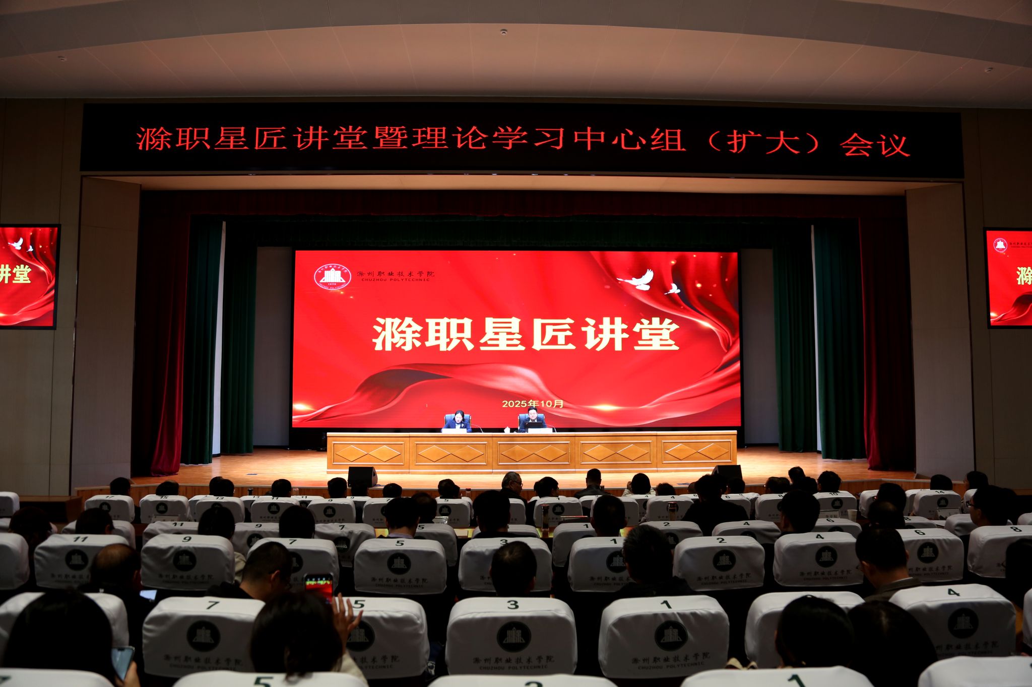 10月22日下午,学校在6号楼报告厅召开滁职星匠讲堂暨党委理论学习中心组(扩大)会议,校党委书记陈飏主持会议并讲话。会议邀请广东省智慧职业教育大数据工程研究中心常务副主任、广州职业技术大学教授詹增荣博士作专题报告。学校领导班子成员出席会议,全体教职工参加会议。