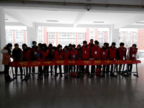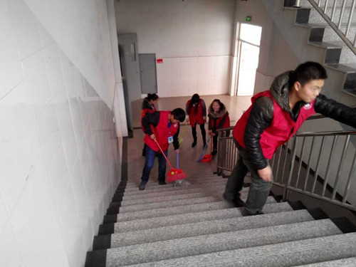 (志愿者们仔细的清扫系部大厅)