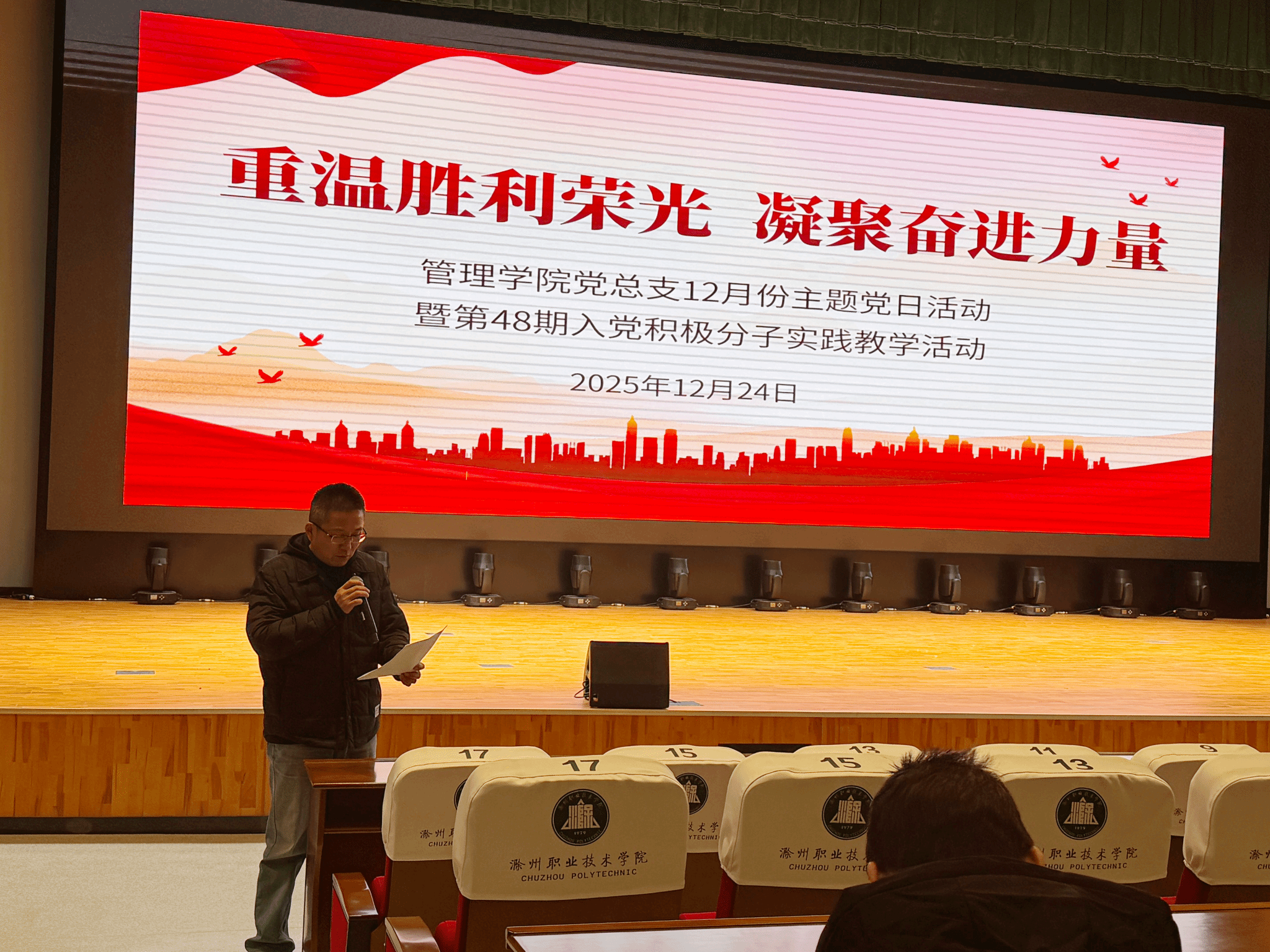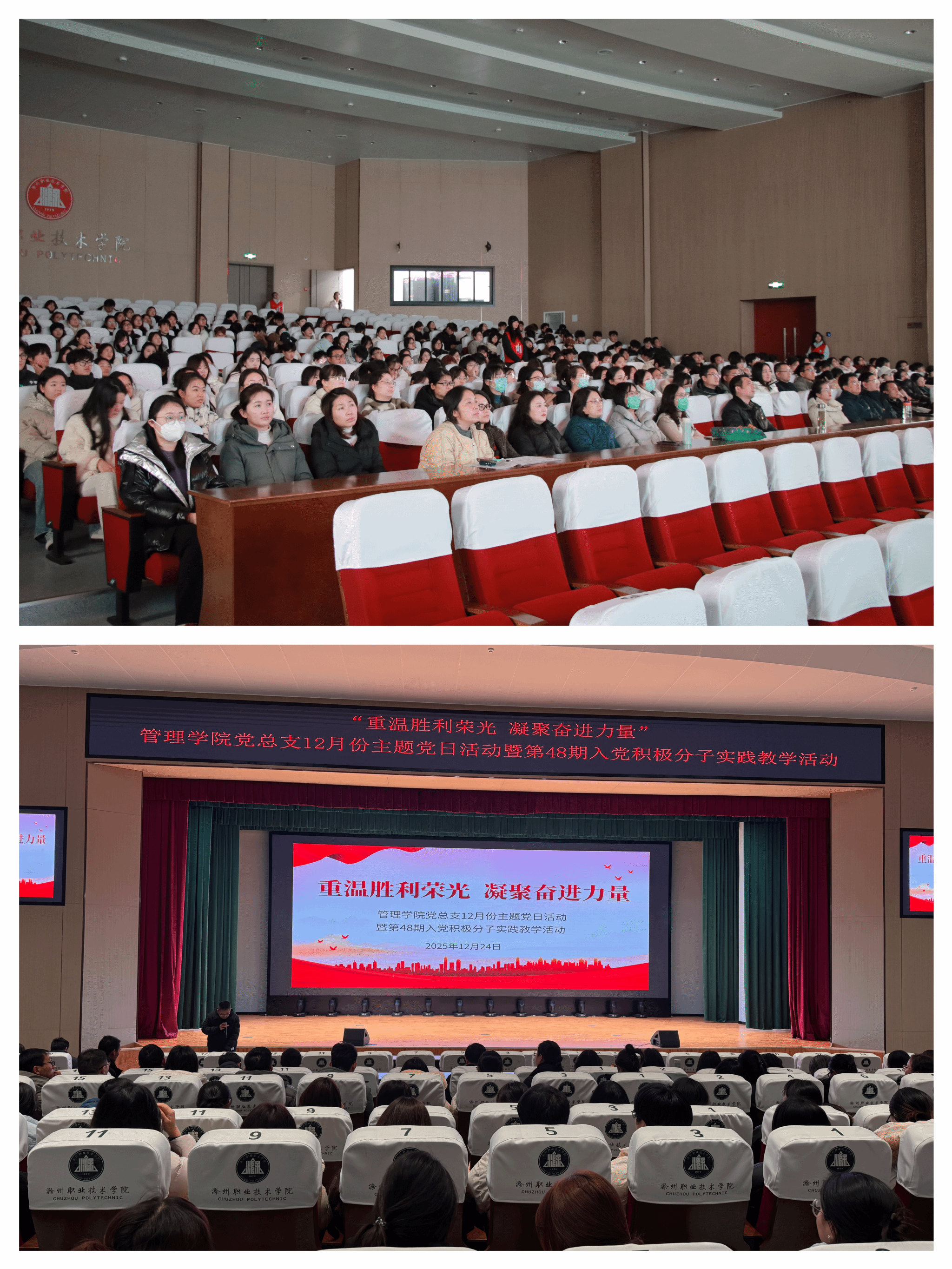 为深化爱国主义教育,重温革命历史,凝聚奋进力量,管理学院党总支于2025年12月24日下午,在学校6号楼报告厅开展“重温胜利荣光 凝聚奋进力量”12月份主题党日活动暨第48期入党积极分子实践教学活动。本次活动由管理学院党总支组织,管理学院党总支党员教师、入党积极分子及部分班级学生参与。