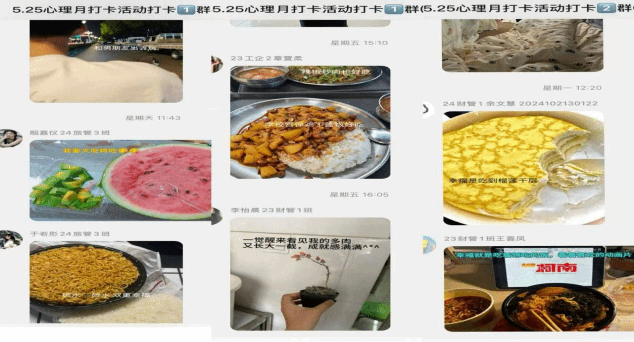 5月24日- 5月30日,“一周幸福心能量” 打卡计划在 QQ 群进行。活动期间,同学们积极分享生活中的幸福瞬间,一条简单的文字记录、一张温馨的照片、一段有趣的短视频,都承载着大家对美好生活的热爱。“室友分享的零食,甜到心里”“幸福是看到多肉又长大一截”…… 这些点滴幸福汇聚成温暖的洪流,感染着群里的每一个人。最终,38名同学脱颖而出,凭借连续7天的坚持打卡,兑换到了心仪的奖品,更收获了满满的幸福感和积极向上的生活态度。