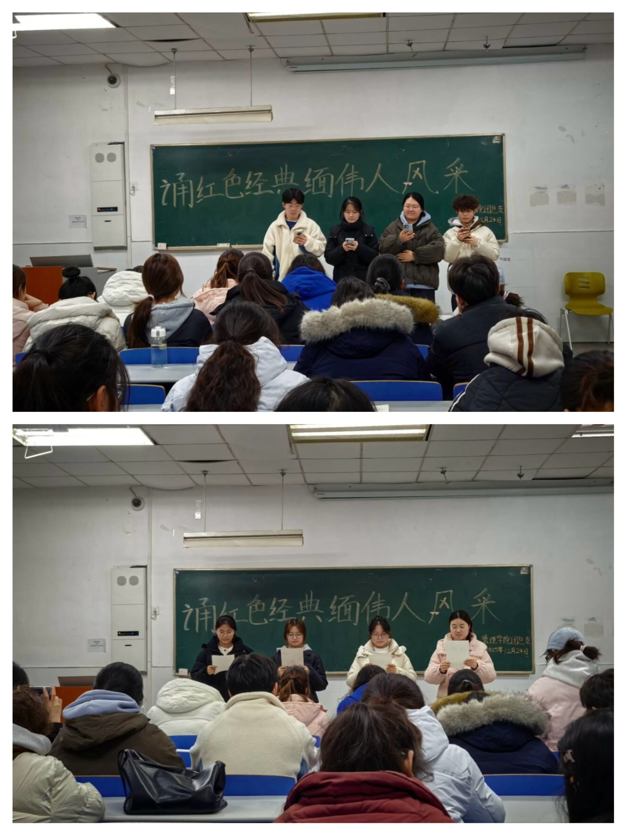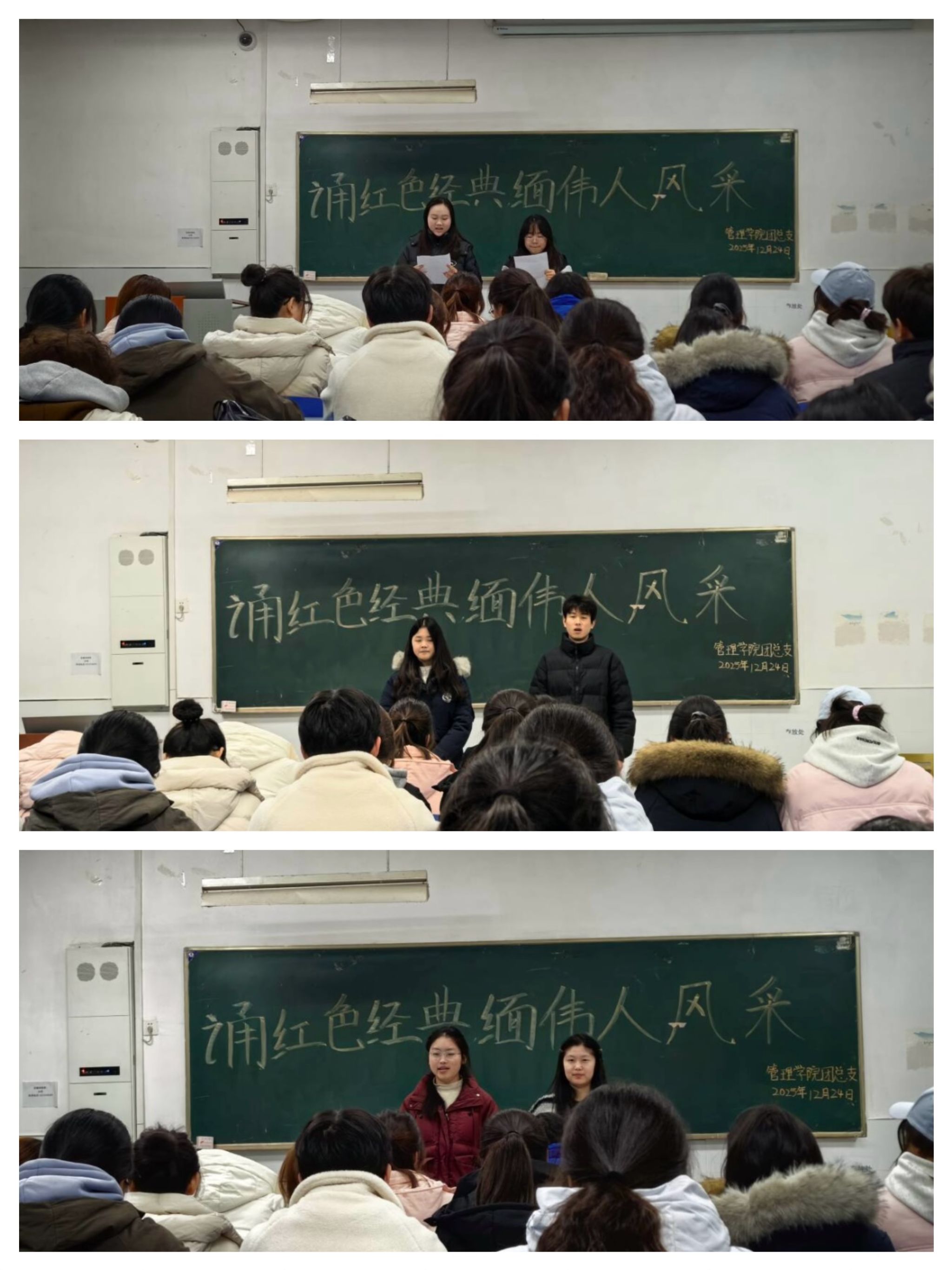 为传承红色基因,缅怀革命伟人崇高风范,引导青年学子厚植家国情怀,2025年12月24日,管理学院团总支开展“诵红色经典,缅伟人风采”主题诗朗诵活动,管理学院2025级学生积极参与。