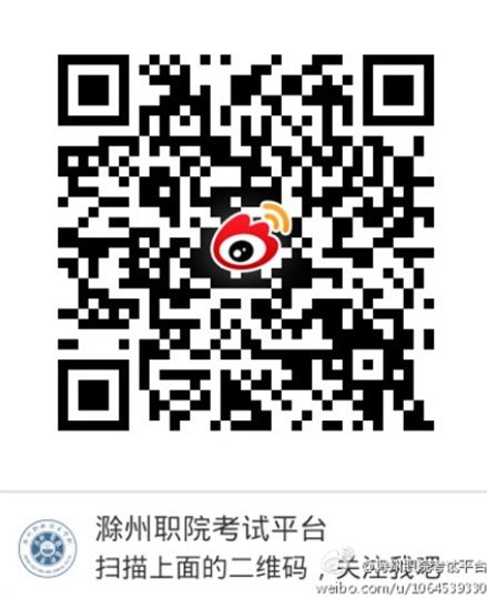 :开通并登录新浪微博,搜索“滁州职院考试平台”或手机扫描下面二维码加关注,即可及时了解学院考试相关信息。