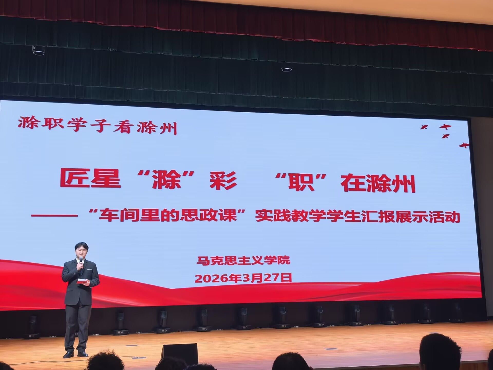 为深入推进“大思政课”建设,全面落实立德树人根本任务,3月27日,马克思主义学院于6号楼报告厅,成功举办“匠星‘滁’彩 ‘职’在滁州——‘滁职学子看滁州’‘车间里的思政课’实践教学成果汇报展示活动”。全校600余名师生齐聚现场,共赴一场兼具理论深度与实践温度的鲜活思政课堂。
