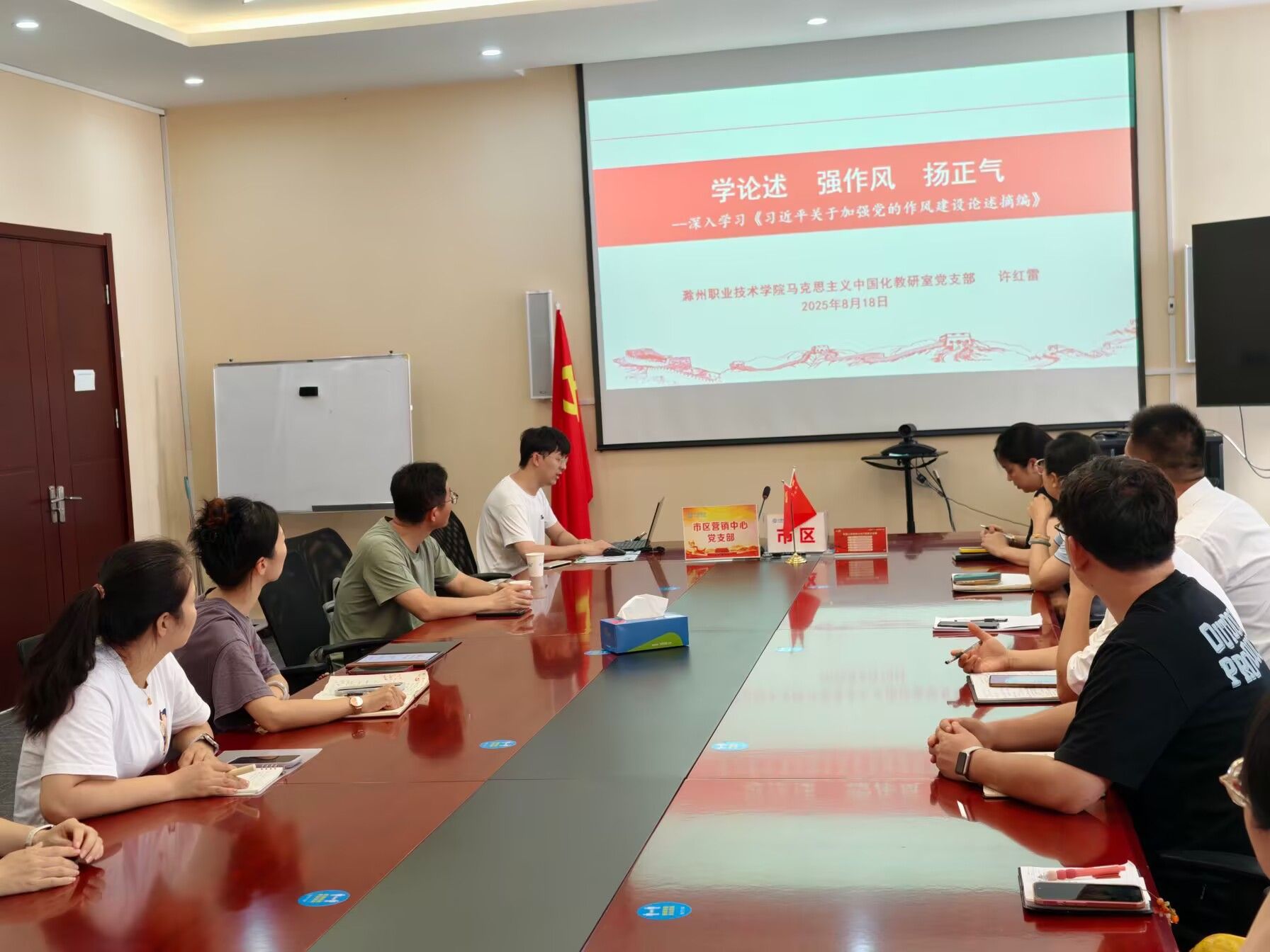 活动中,马克思主义中国化教研室党支部青年教师许红雷以“学论述 强作风 扬正气——深入学习《习近平关于加强党的作风建设论述摘编》”为主题,结合历史与现实、理论与实践,分别从习近平总书记关于加强党的作风建设的重要论述思想渊源、主要内容和鲜明特征三方面进行阐述,深刻阐释了作风建设关乎党的事业兴衰成败的极端重要性。