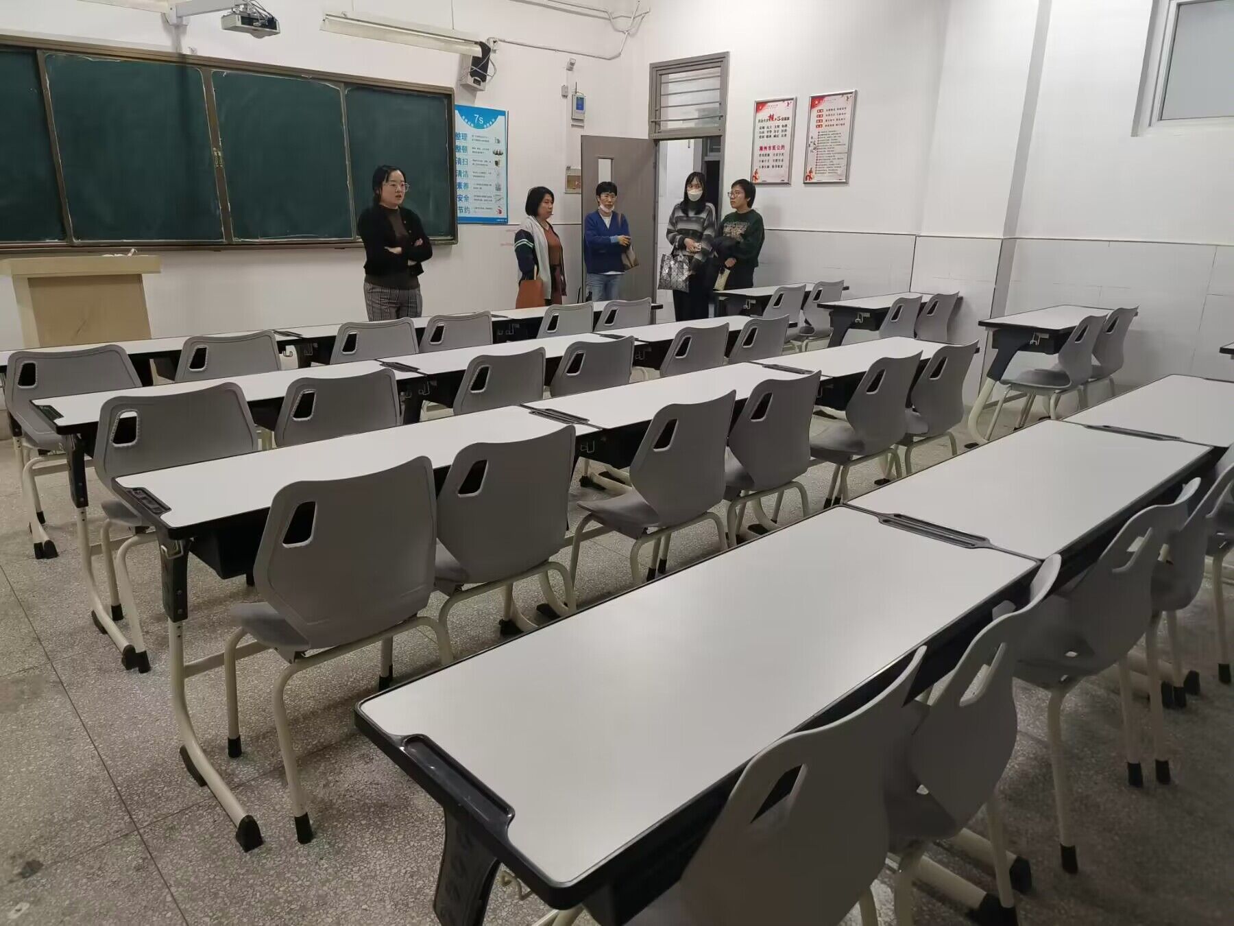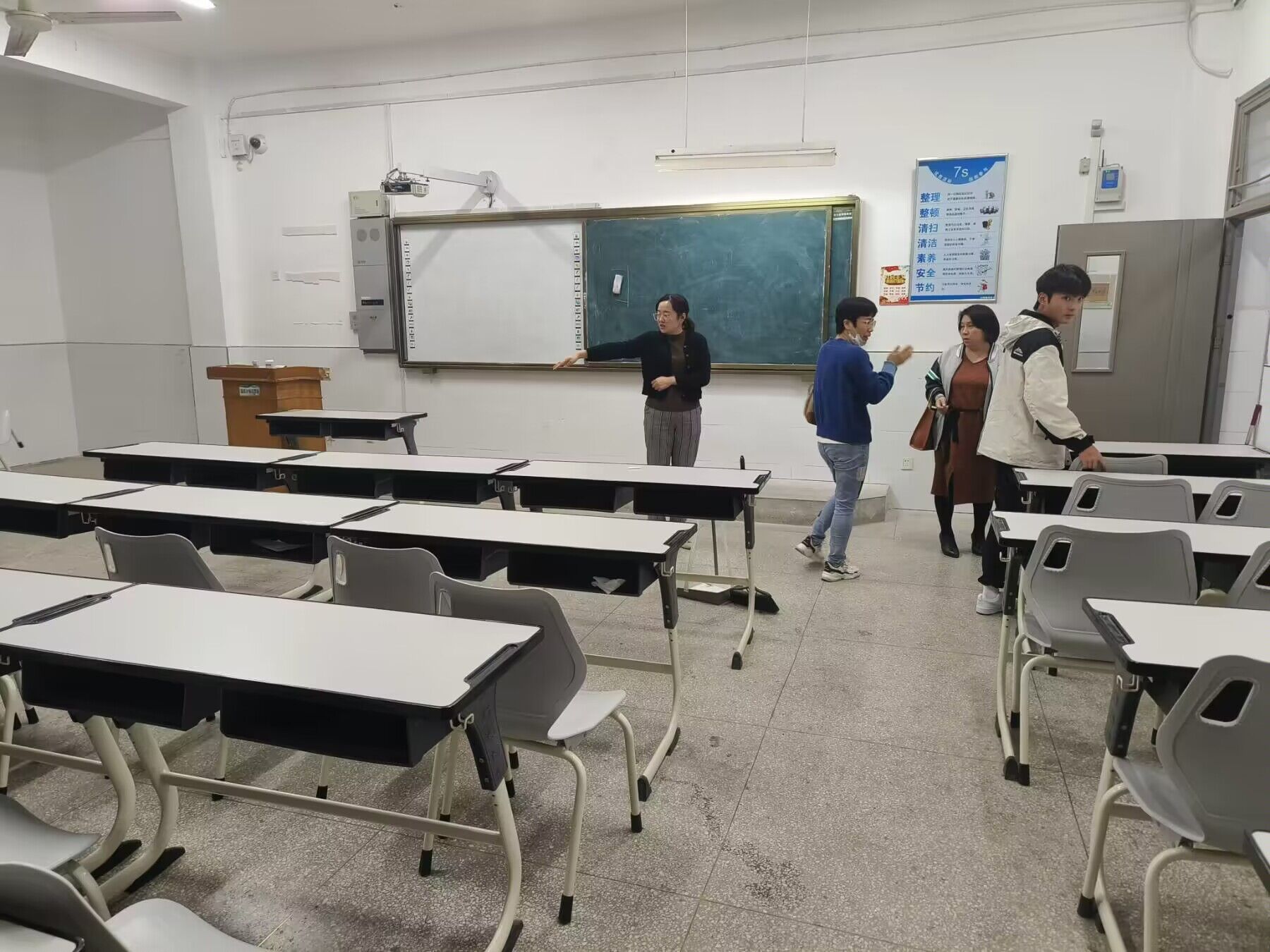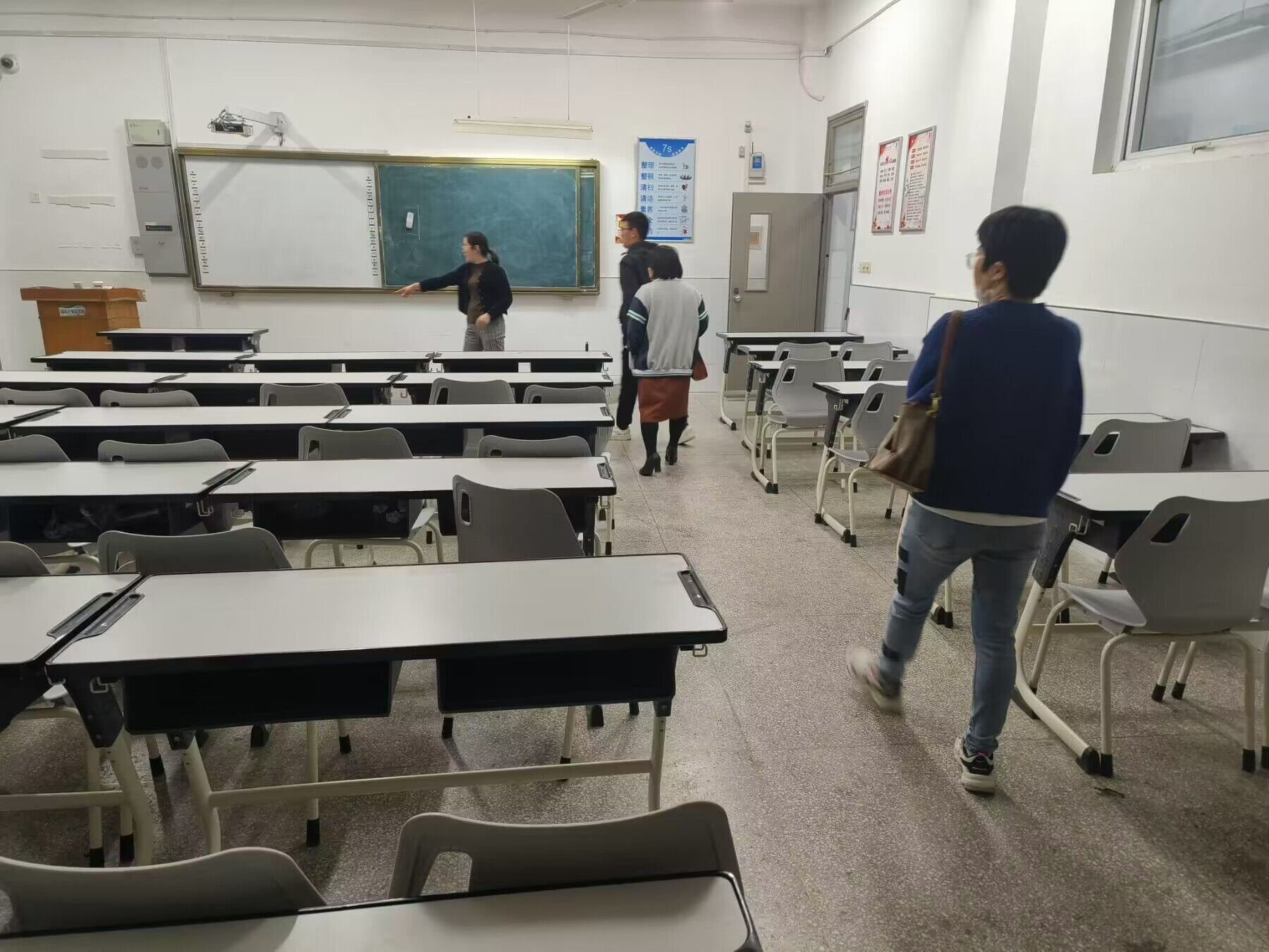老师们仔细检查了教室的每一处地方,从黑板直到卫生角。在留心是否存在垃圾残留的同时,还为学生排除了教室可能存在的的安全隐患。