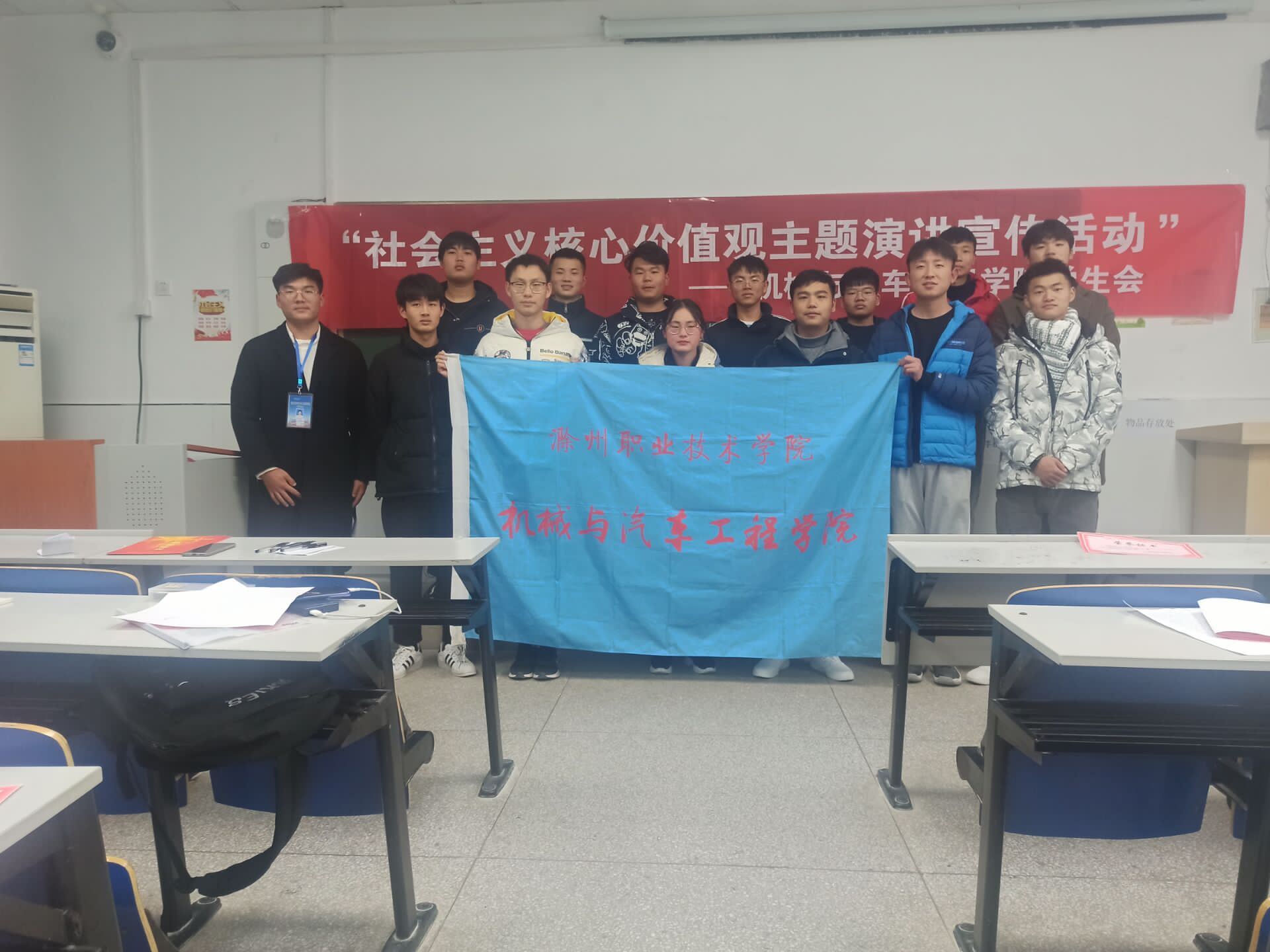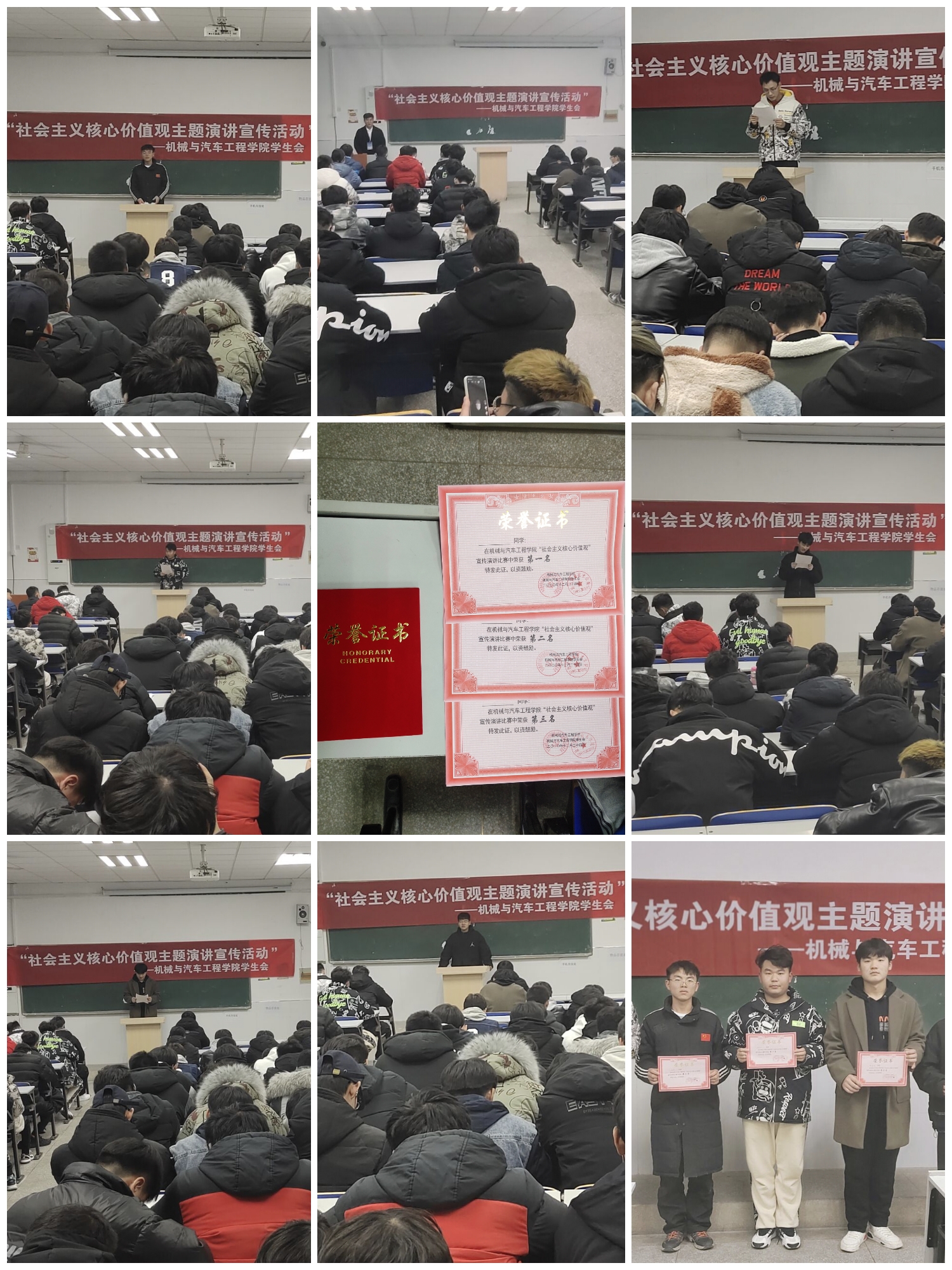 20201224日星期四晚上,机械与汽车工程学院在教学楼5113教室开展“社会主义核心价值观”主题宣传演讲活动。本次活动由机械与汽车工程学院学生会承办,机械与汽车工程学院学生会干事卢宇航同学担任活动主持人,机械与汽车工程学院团学干事徐晓龙余学远梁瀚允,黄鹏飞担任活动评委,参加比赛的选手为2020级各班级代表。