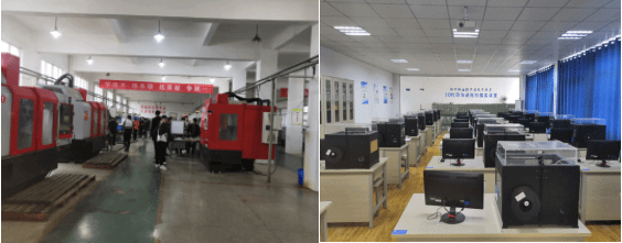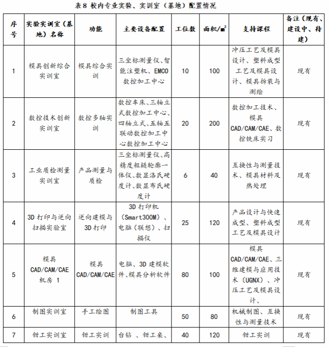 模具设计与制造专业借助省级高水平专业群建设的有利条件,加大实践教学条件投入,现有制图实训室、钳工实训室、、模具创新综合实训室、模具 CAD/CAM/CAE 机房、数控技术创新实训室、工业质检测量实训室、3D打印与逆向扫描实验室、钳工实训中心等实验实训场所,可为学生提供全面的实习操作条件。