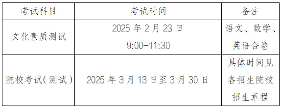 报考分类考试和对口招生的考生均须参加全省统一组织的文化素质测试,成绩达线考生方可参加招生院校组织的院校考试(测试)。
