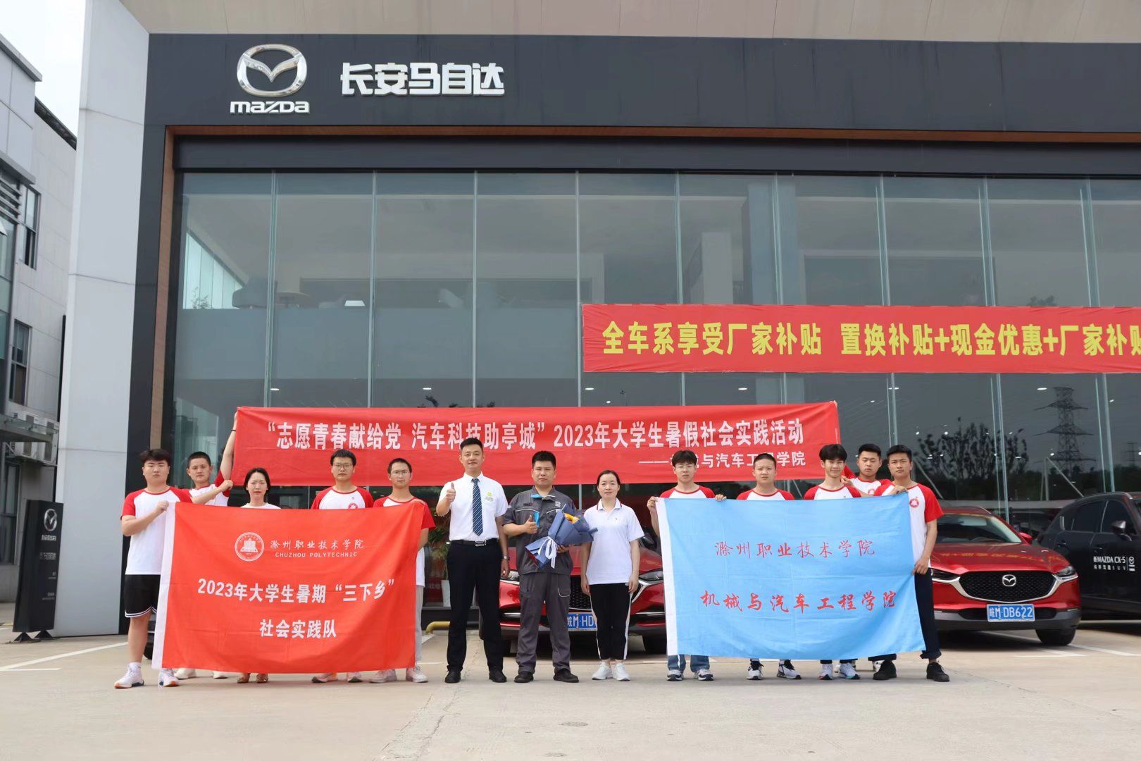 6月21日上午,滁州职业技术学院机械与汽车工程学院青春引擎实践小分队在倪子旭、陈琴两位老师的带领下前往滁州马自达4S店开展暑期“三下乡”社会实践活动。