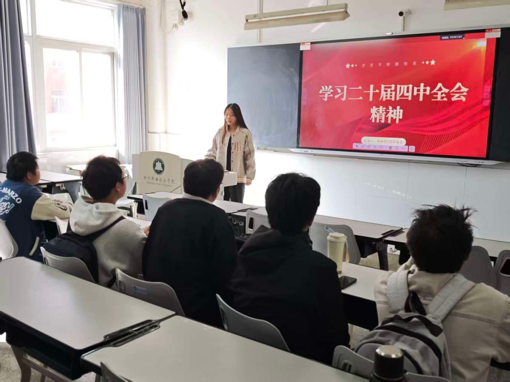 在学习现场,教室的电子屏上醒目展示着“学习党的二十届四中全会精神”的主题内容,团支部学生骨干钟美霖站在台前,结合PPT演示,从全会召开的重大意义、核心部署等方面展开系统讲解,重点聚焦全会中关于“建设现代化产业体系”“发展新质生产力”“推动制造业高端化、智能化、绿色化发展”等与机械汽车领域紧密相关的内容,结合新能源汽车技术专业的发展趋势和行业需求,为同学们解读全会精神对专业学习和职业发展的指导价值。