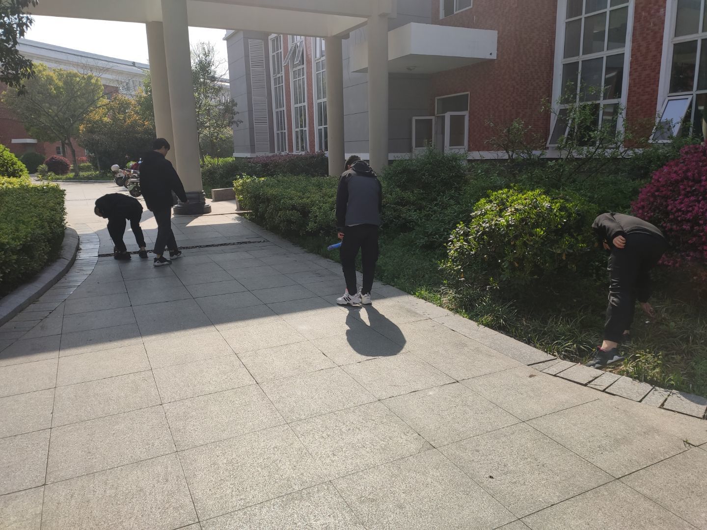 打扫过程中,同学开始分组打扫不同的区域,或是用扫帚清理道路上的落叶,或是用手捡起地上的垃圾,一个同学拿着扫帚,另一个用工具承装,同学们热情洋溢的进行清扫活动。展现学生阳光向上,精神饱满的良好状态.