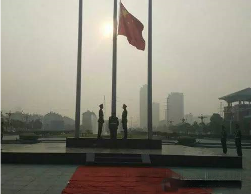 五星红旗在朝阳的余晖下,缓缓升起,散发出胜利的光芒。五星红旗使我们牢记历史,督促我们要内外兼修,只有强大自己,才能强大国家。