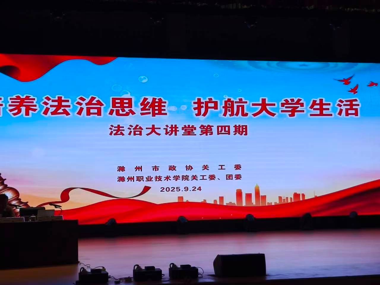 为提升学生法律认知与风险防范能力,9月24日下午15:00,滁州职业技术学院在大礼堂举办专题法制宣讲活动,邀请陈书记、杨书记、王宇处长出席,全院学生代表参会。