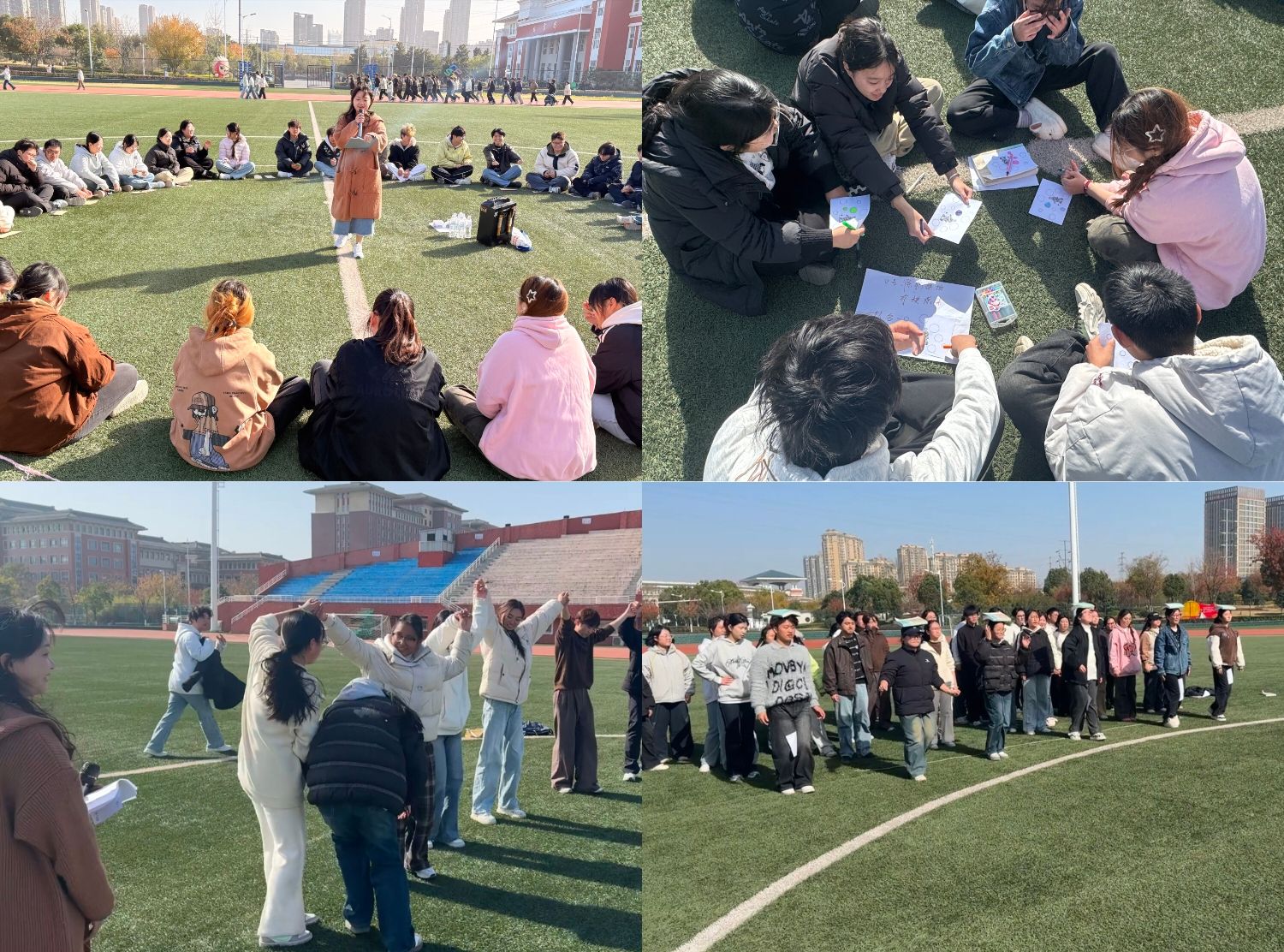主题活动环节精彩纷呈。“群龙取水”考验团队协作,同学们互相协助、默契配合,顺利完成任务;“爱的魔力转圈圈”让大家在趣味运动中提升默契度;“夹纸传书”则锻炼了同学们的平衡能力与专注力。最令人动容的是“敞开心扉”环节,同学们在压力圆圈纸上涂色表达压力大小,分享近期困扰、减压方法与开心事,彼此倾听、互相鼓励,感受着集体的温暖。最后,全体同学围成一圈,为彼此捶背揉肩,轻声道一句“辛苦啦”,缓解了身心疲惫,也让同学间的距离悄然拉近。