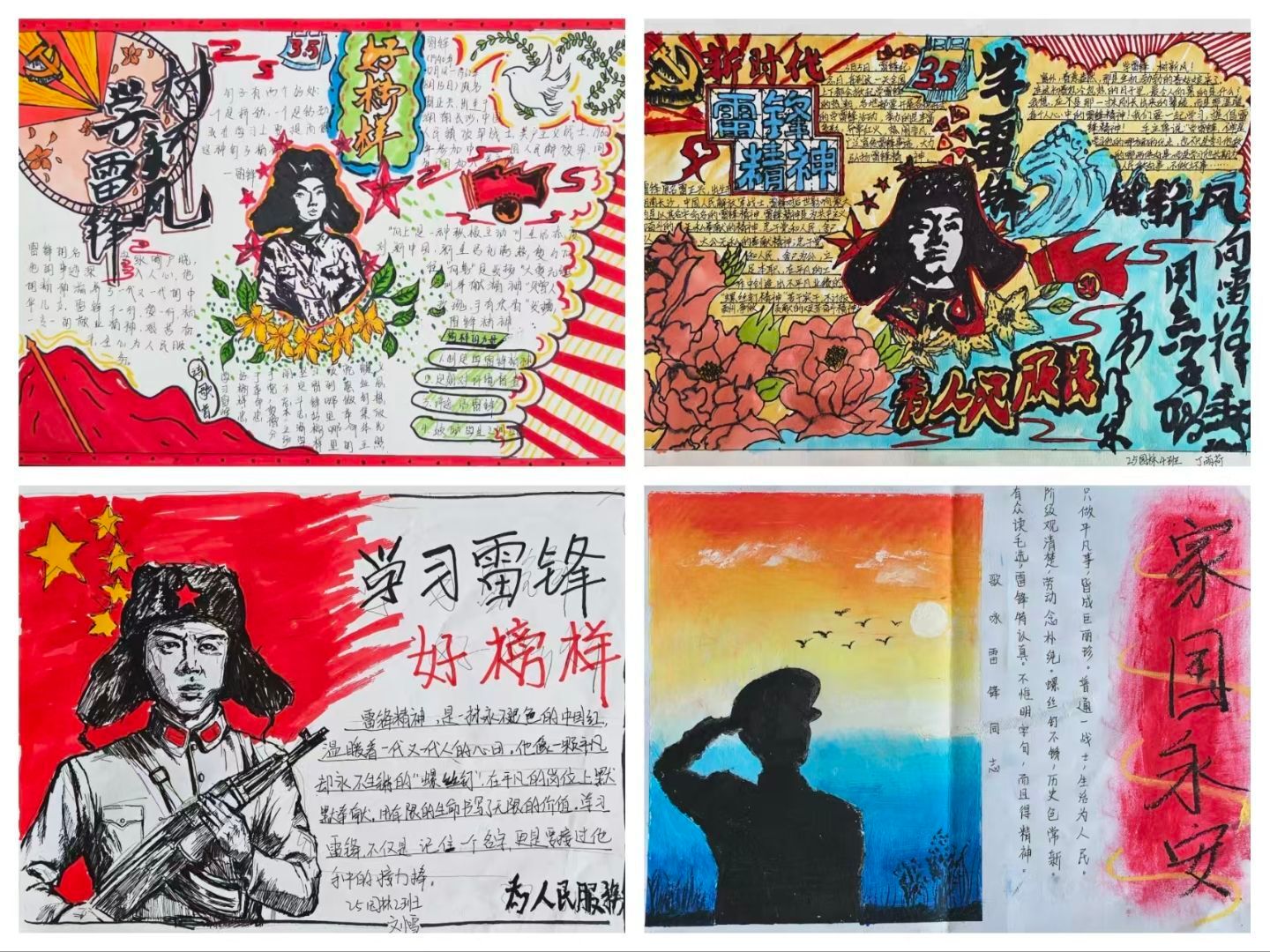 活动启动后,同学们利用课余时间查阅资料、精心构思,围绕雷锋事迹、雷锋日记、志愿服务、身边好人好事、新时代文明实践等内容展开创作。一幅幅作品主题鲜明、版式新颖、色彩明快,既有对雷锋同志光辉形象的生动描绘,也有名言警句的深情摘抄,更有对互助友爱、奉献担当的真切表达,一笔一画尽显认真,一字一句饱含敬意,充分展现了学子积极向上、向善向美的精神风貌。