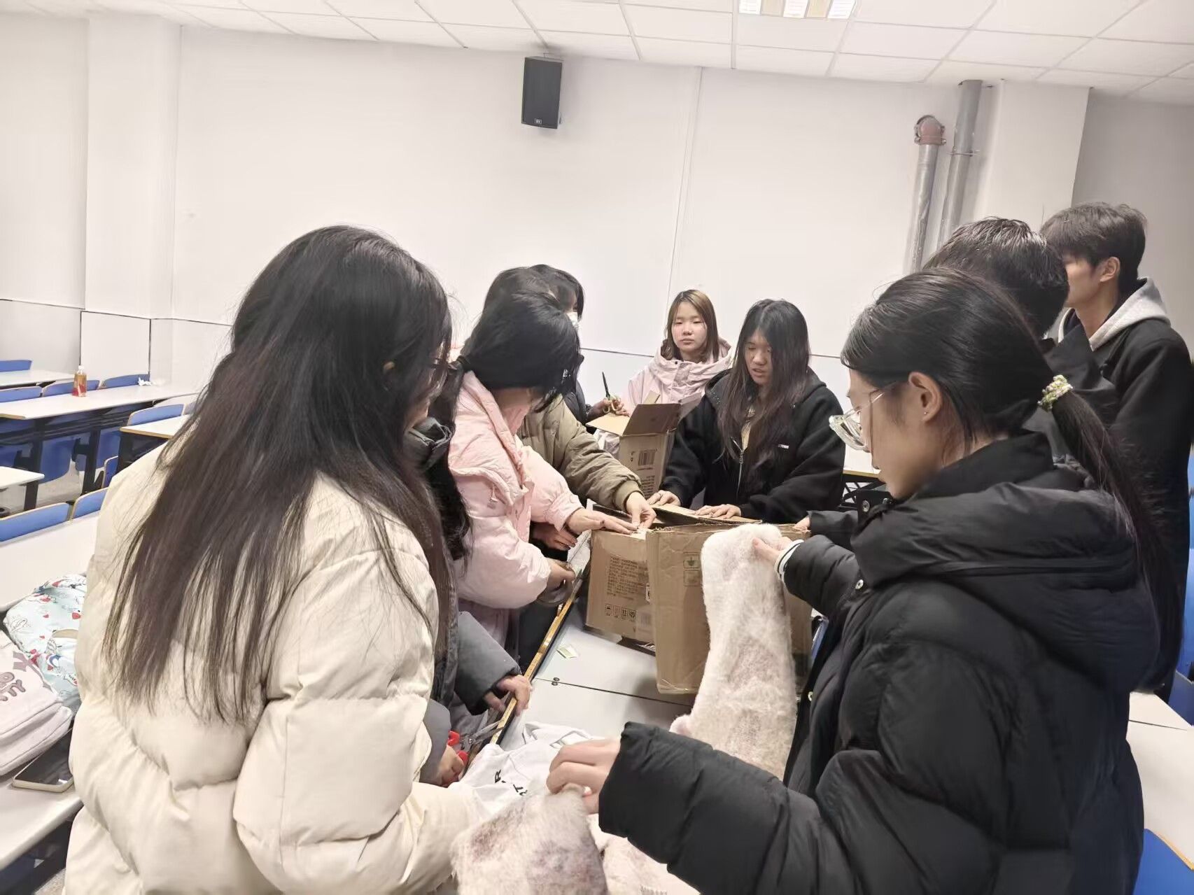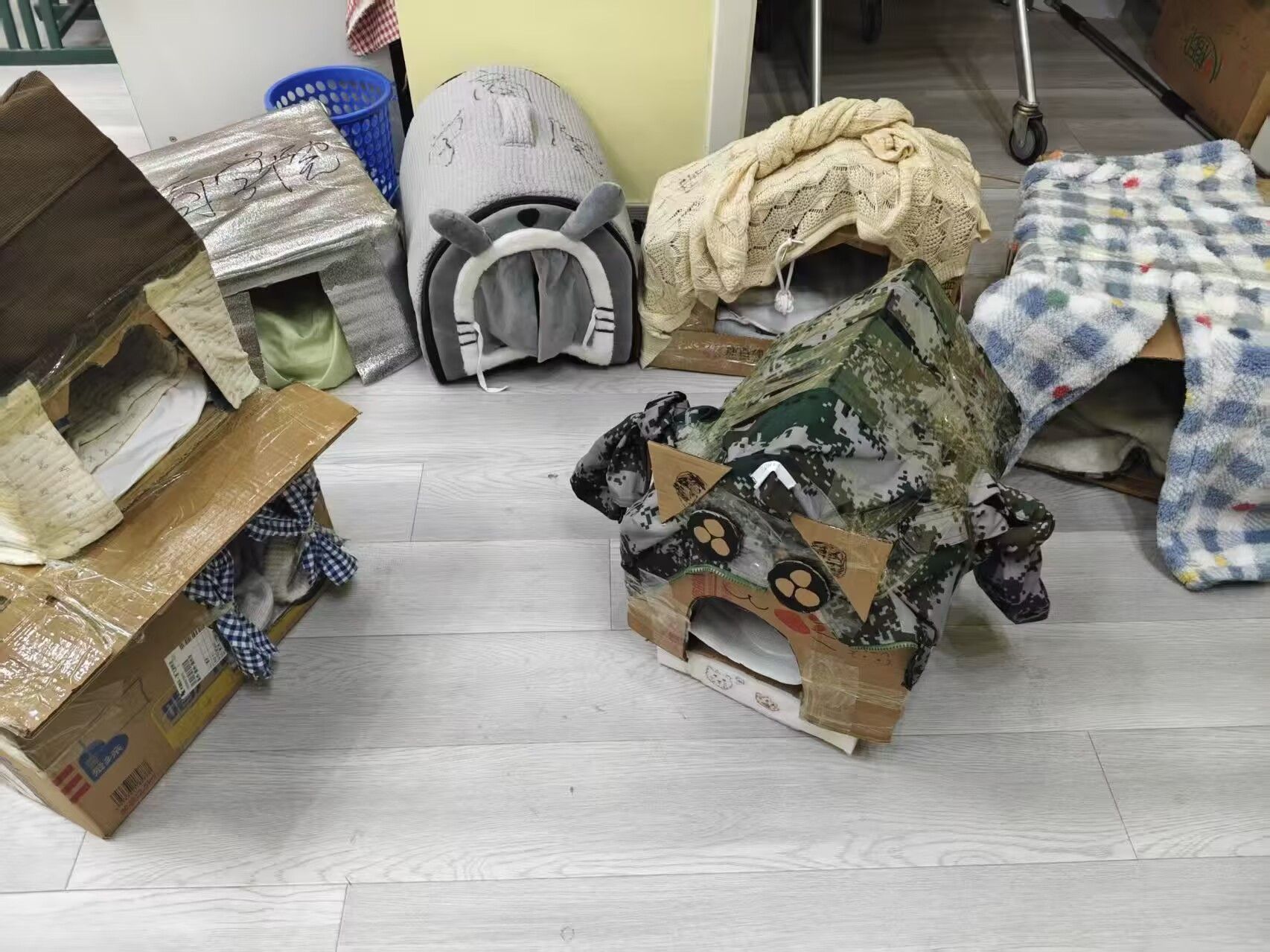 活动筹备阶段,来自商学院的50名志愿者便提前行动,分为五个小组,利用废弃纸壳和回收衣服,集中制作保暖猫窝。活动现场,志愿者们分工明确,有的将纸壳裁剪成合适大小搭建窝体,有的把回收衣物剪成碎料填充保温,有的仔细加固窝边防止松散,齐心协力为校园流浪猫打造出一个个温暖的“小家”。