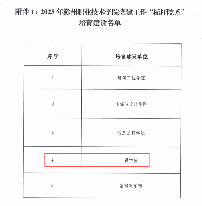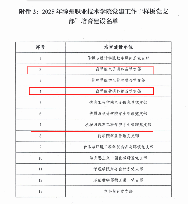 近日,中共滁州职业技术学院委员会印发《关于公布滁州职业技术学院党建“双创”培育建设名单的通知》(校组〔2025〕16号),商学院成功入选党建工作“标杆院系”培育建设名单,商学院电子商务系党支部、商学院营销外贸系党支部和商学院学生管理党支部全部成功入选“样板党支部”,实现了院系党组织建设与基层支部建设的双示范、全覆盖,充分彰显了商学院党总支在推动党建与事业发展深度融合方面的扎实成效。