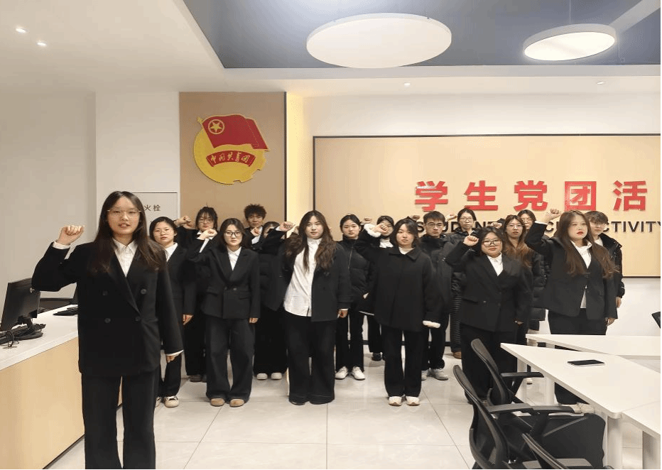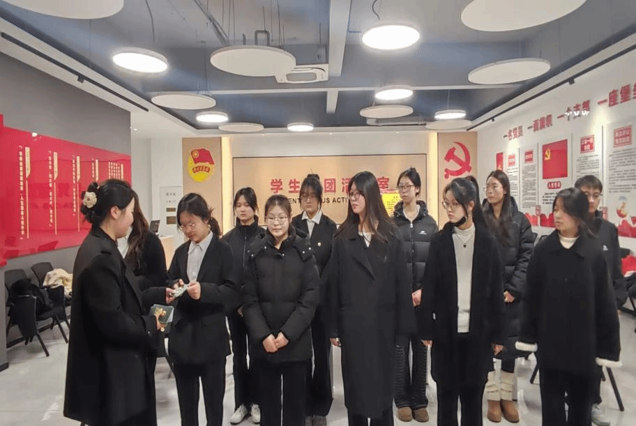 仪式开始前,主持人宣读了新团员名单,老团员代表为新团员佩戴团徽,全体新团员面向团旗庄严宣誓,铿锵有力的誓言回荡在现场,彰显着青年团员的责任与担当。新团员将以入团为新起点,严格遵守团的章程,勤奋学习专业知识,积极投身社会实践。
