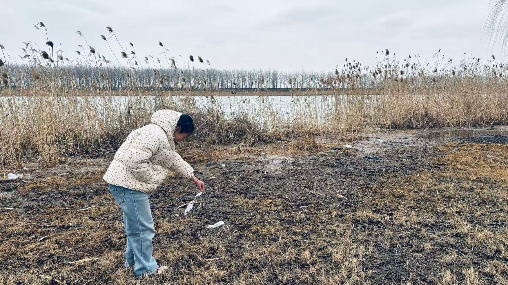 活动中,学子们赴淮河支流滩涂湿地,顶着寒意分工协作,俯身捡拾塑料垃圾、纸屑等废弃物,细致清理草丛与泥地中的杂物,为水乡岸线“焕新洁面”。