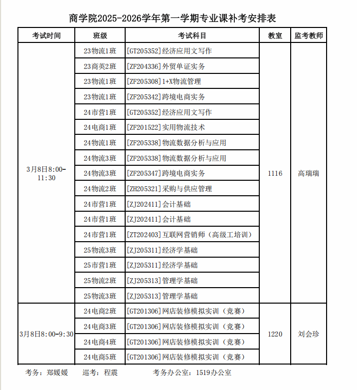 商学院2025-2026学年第一学期专业课补考安排表