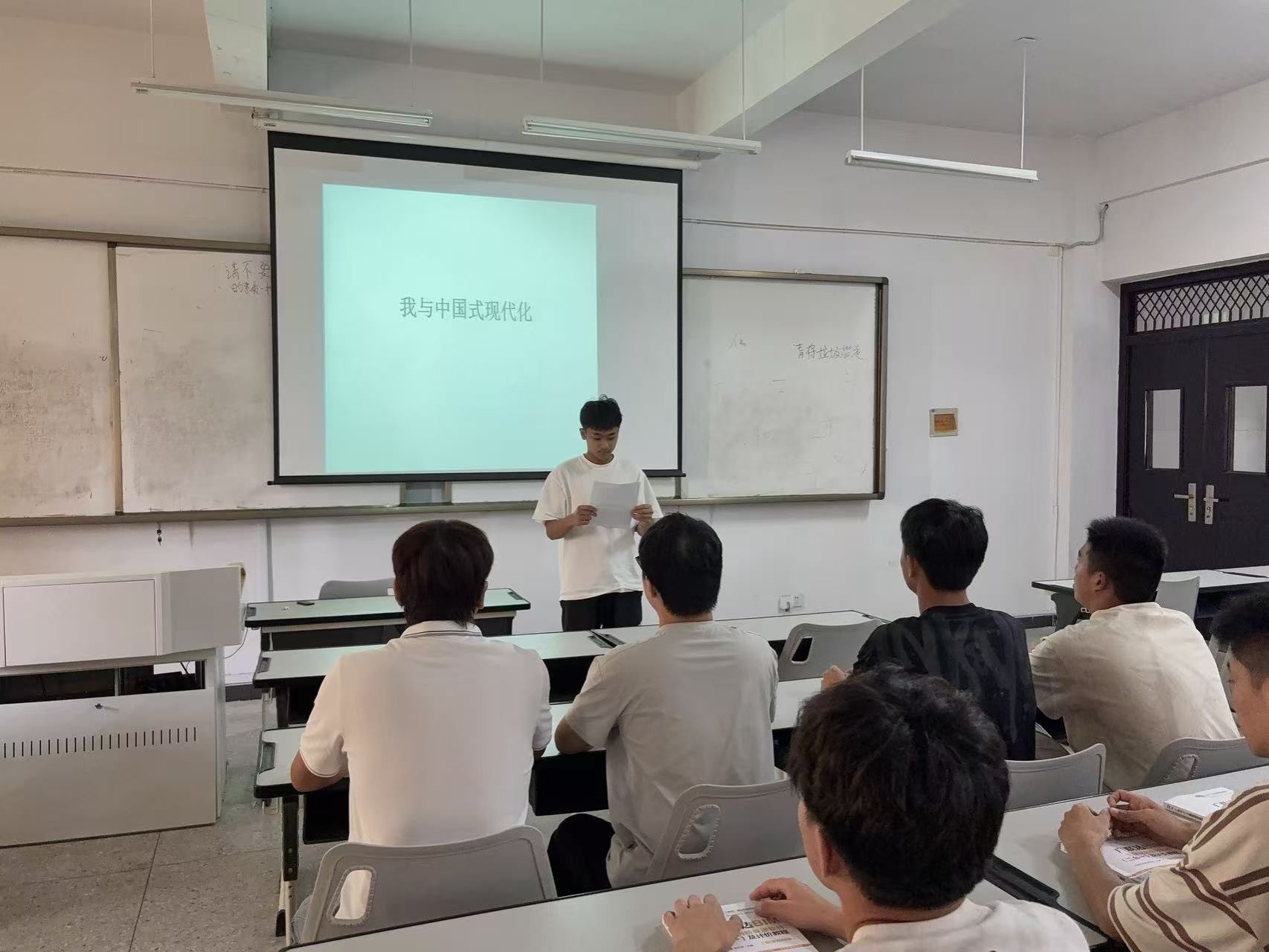 辅导员结合班级专业特色,对学生的发言逐一回应:“中国式现代化的‘中国’二字,既是根基也是底气。作为建工学子,你们的每一张图纸、每一次测量,都是在为‘中国式现代化’添砖加瓦。希望同学们牢记:‘强国有我’不是口号,而是‘学好专业、扎根实践、服务人民’的具体行动。”