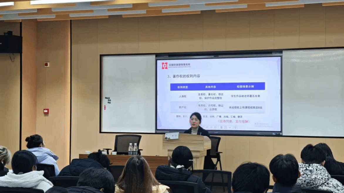 授课过程中,李宇律师系统梳理知识产权法核心条款,明确著作权、专利权等核心权利的保护范围,重点解读“作品”在校园场景的具体适用——明确建筑设计图、学术论文、课程设计方案等均属于受法律保护的作品类型。针对同学们易混淆的权利边界问题,律师着重讲解“合理使用”“法定许可”的12种具体适用情形,包括自学引用、课堂教学引用等校园常见场景,同时针对性厘清“网络图片无版权”“非商用不侵权”等认知误区,帮助同学们清晰掌握合法使用知识产权的边界尺度。
