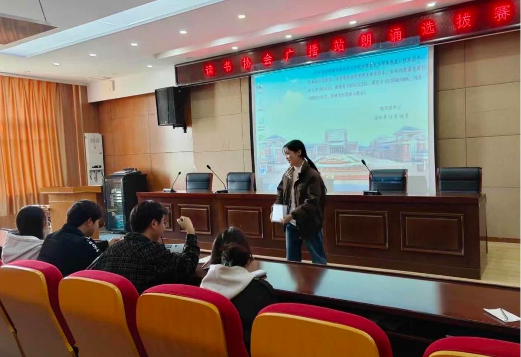 为遴选第十五届社团文化节闭幕式朗诵节目优质人选,彰显校园文化活力,2025 年 11 月 23 日中午,读书与信息素养协会联合广播站举办“传承经典,声颂校园”朗诵人选选拔活动,活动在南阶 205 会议室顺利举行。活动以语言为桥、以经典为魂,吸引了全校各院系朗诵爱好者踊跃参与。