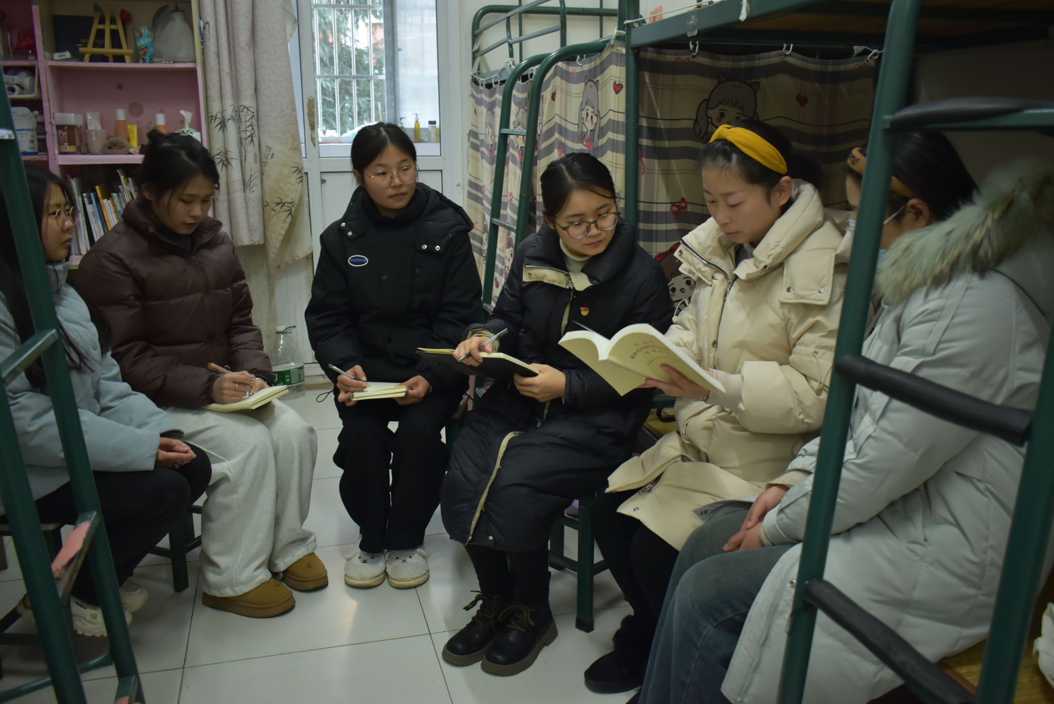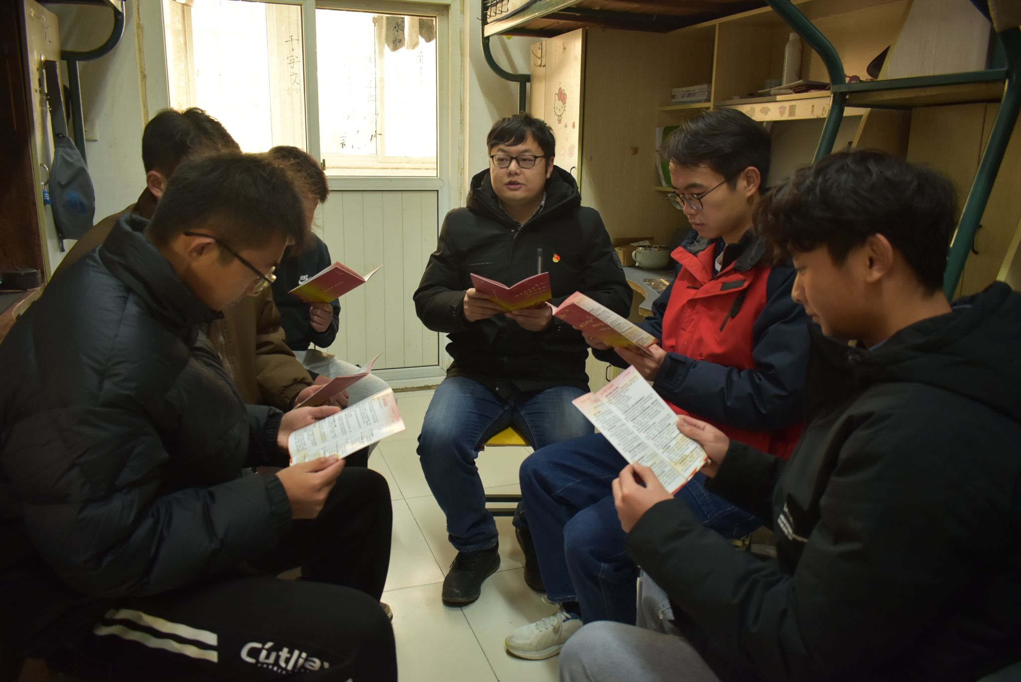 党员教师与同学们围坐在一起,共同学习新思想,深入交流思想、探讨学习感悟。“同学们,你们知道党的十八大以来,我们经历的三件大事是什么吗?”在5号楼5131宿舍,闵文围绕党的二十大报告,向同学们阐释了“十年来三件大事”,“中国共产党的中心任务”,“牢牢把握五个重大原则”,“三个‘务必’”等重点内容。“文化自信是一个国家、一个民族发展中最基本、最深沉、最持久的力量,我们要坚定文化自信,勇于担当使命、奋发有为。”在3号楼3129宿舍,李瑞瑞阐述了《习近平新时代中国特色社会主义思想专题摘编》部分内容。通过党员教师的宣讲引导,同学们学习的热情被进一步激发,大家纷纷表示要增强学习党的最新理论成果的自觉,不断提升自身思想政治理论水平与觉悟,主动担当作为。