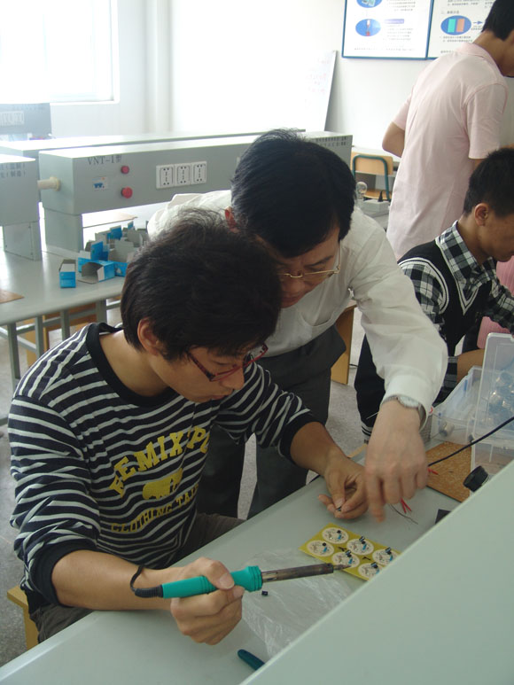 院领导察看学生在信息系校内生产车间生产情况