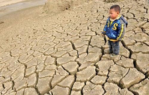 3月16日,贵州省开阳县城关镇青西村村民付燕子带着孩子在水库底找水。