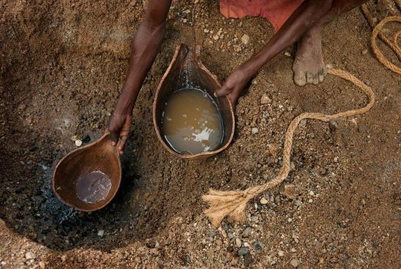 Matumburu村的一位坦桑尼亚少女脚撑着井壁,在舀取混水。她等了十个小时才轮到自己。队列里下一个人还要等近一个小时,才能等到井里渗出足够他舀的水。