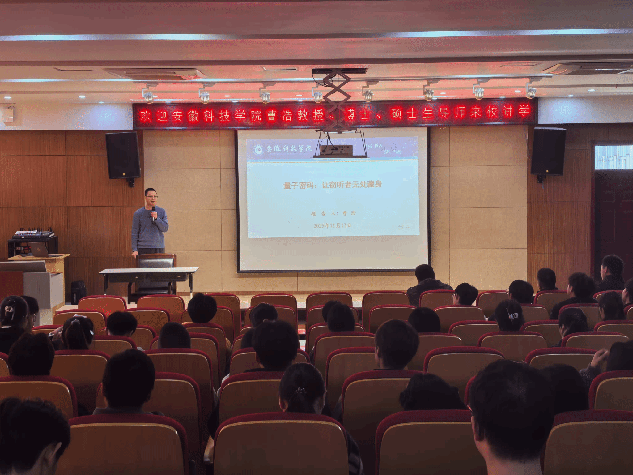 2025年11月12日,滁州职业技术学院南阶203报告厅内座无虚席,一场内容翔实、视野开阔的专题讲学在此顺利开展。安徽科技学院信息与网络工程学院教授、博士、硕士生导师曹浩应邀莅临我校,为2024级、2025级计算机科学与技术(专升本)班学生及信息工程学院专兼职教师带来题为《量子密码:让窃听者无处藏身》的学术报告。