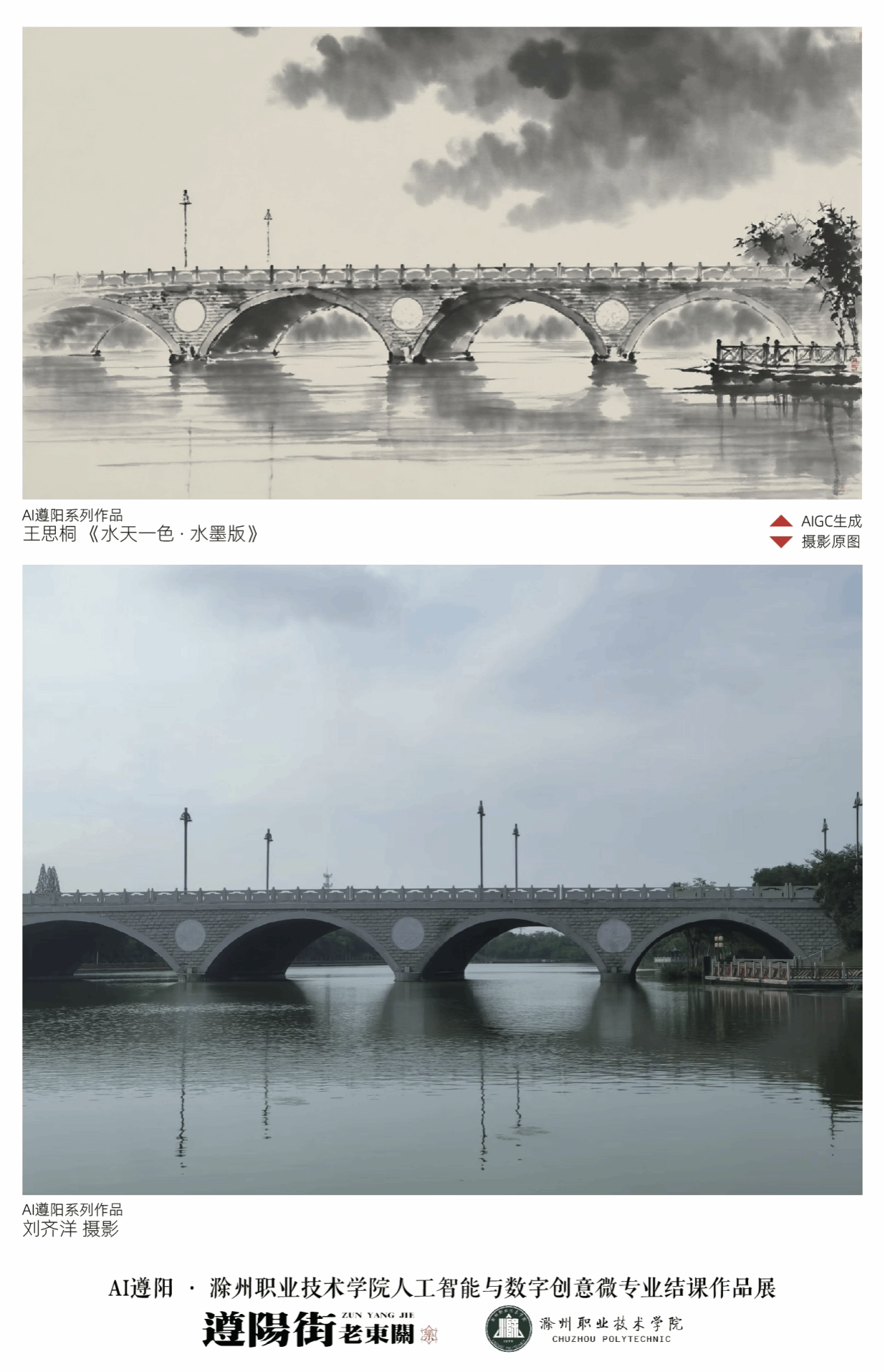 学子们先是采风拍摄,再通过AI技术生成滁州遵阳街地标建筑油画、水墨画、拟人画等多种风格的创新内容,将传统街景与数字艺术深度融合。