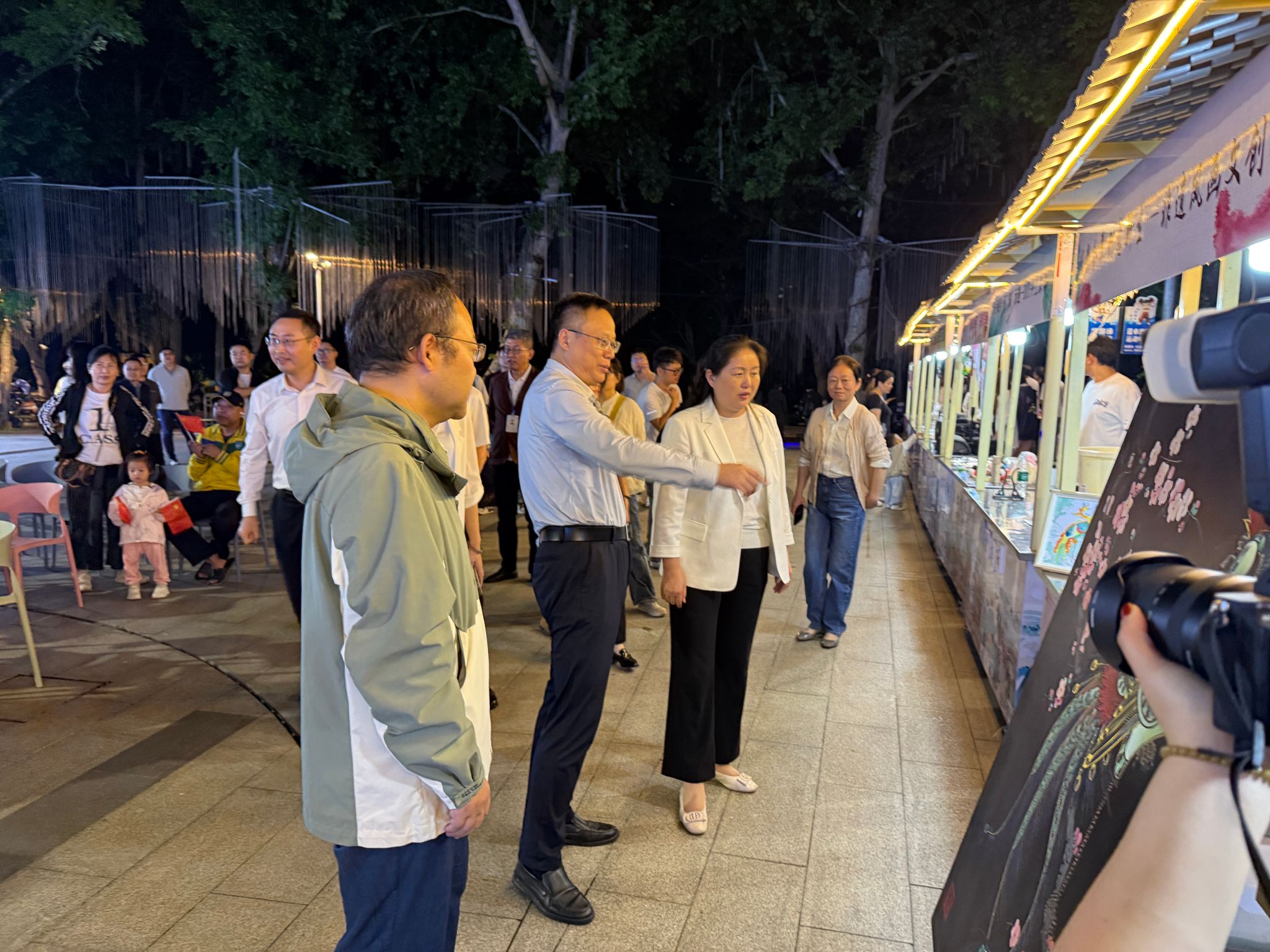 秋夜星辉,灯火璀璨。9月29日晚,由滁州市委人才工作局、共青团滁州市委员会、琅琊区人民政府主办,我校团委、传媒与设计学院等单位共同承办的滁州满天星人才街区2025“庆国庆·迎中秋”青年人才创意集市在悦达889街区火热启幕。我院作为核心承办单位之一,以15个特色展位的亮眼阵容精彩亮相,涵盖非遗传承、公益义卖、教师创新三大板块,校党委书记陈飏等校内外领导莅临现场,企业代表也进行交流。