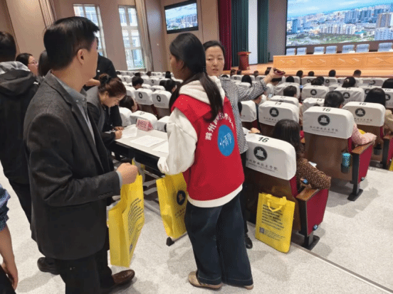 从校园入口到会场沿途,学生志愿者们身着红色志愿服,在多个路口的指示牌旁为参会人员提供引导服务。指示牌清晰标注“换届大会 地点:6号楼报告厅”,志愿者们以热情的态度、专业的服务,确保了参会人员高效、顺利地抵达会场。会场内,志愿者们还承担着资料发放、座位引导等工作,他们的身影成为大会一道亮丽的风景线,展现了我校学子的责任与担当。