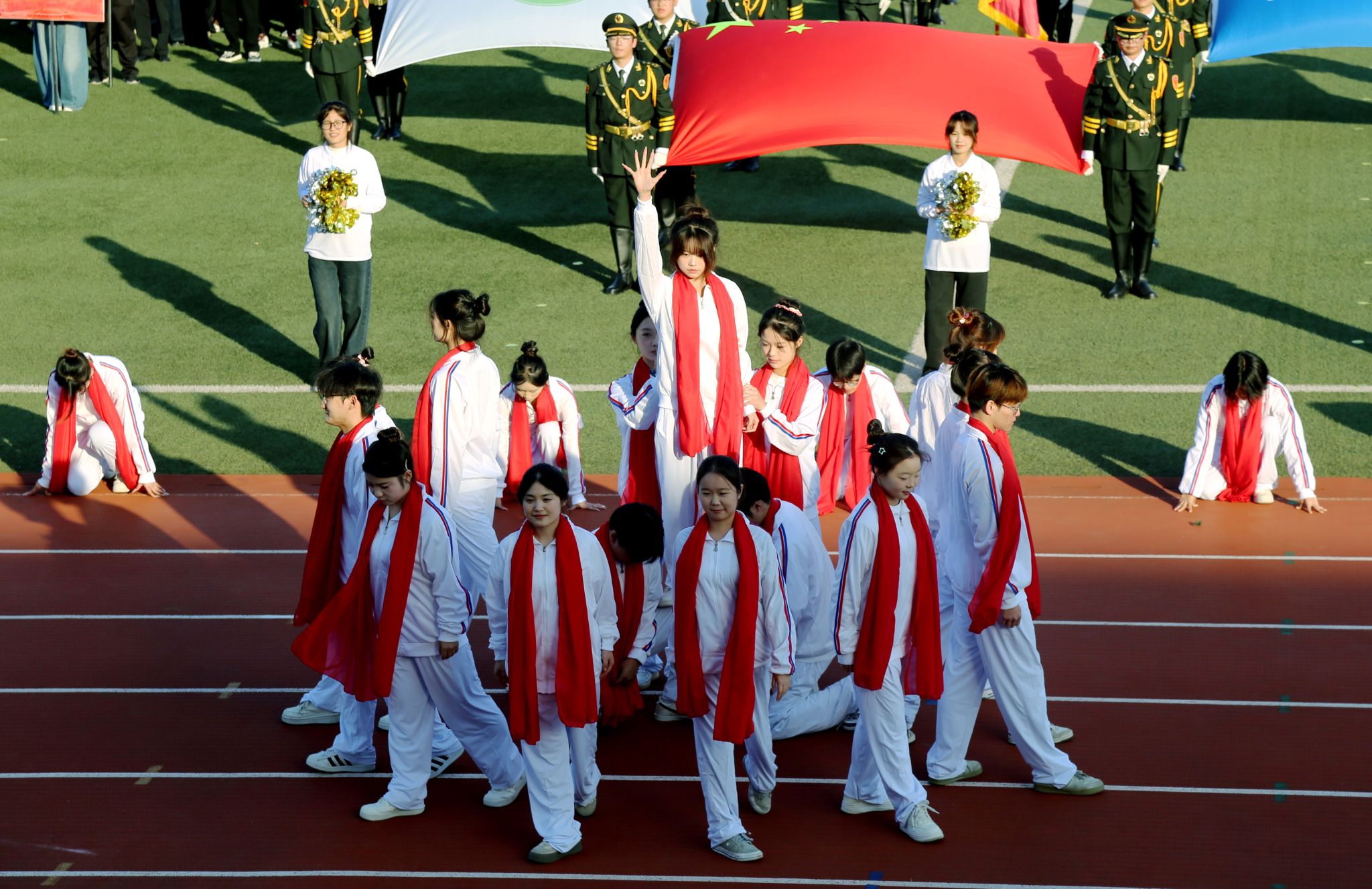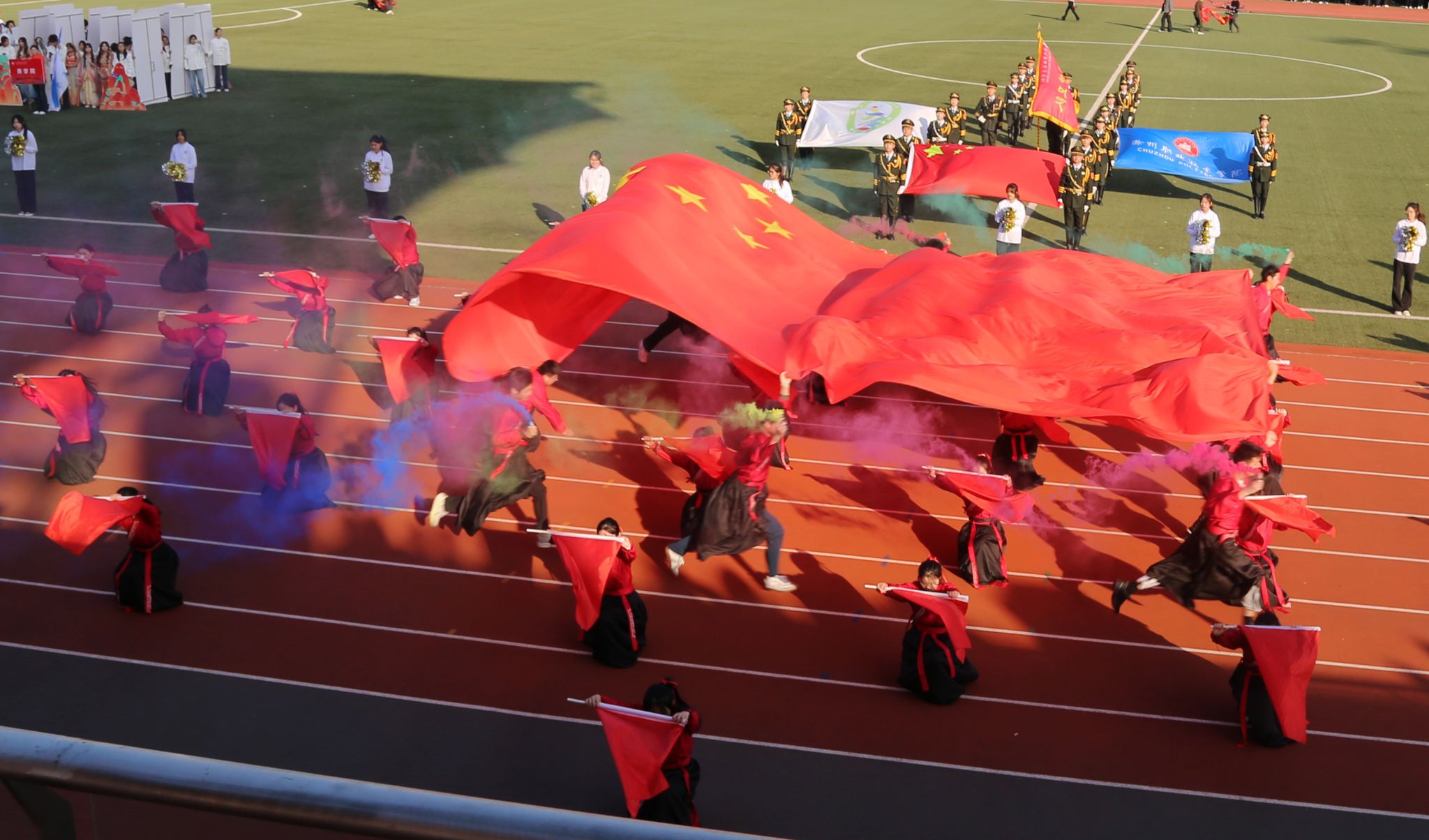入场仪式结束后,全体师生肃立,高唱国歌,注视着五星红旗在湛蓝秋空中冉冉升起,场面庄严而肃穆。