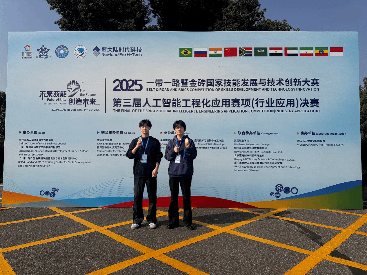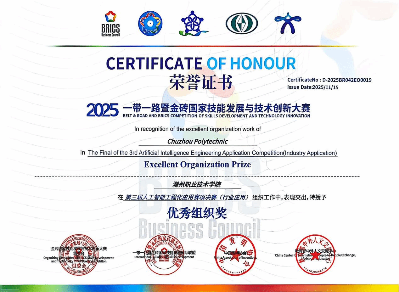 11月15日,2025“一带一路”暨金砖国家技能发展与技术创新大赛第三届人工智能工程化应用赛项(行业应用)全国总决赛在武汉武昌职业技术学院顺利开幕。我校信息工程学院23级物联网班于治豪、24级物联网班吴天明两位同学在全国多支队伍、数百名选手的激烈角逐中脱颖而出,分别斩获二等奖、三等奖,滁州职业技术学院荣膺“优秀组织奖”。