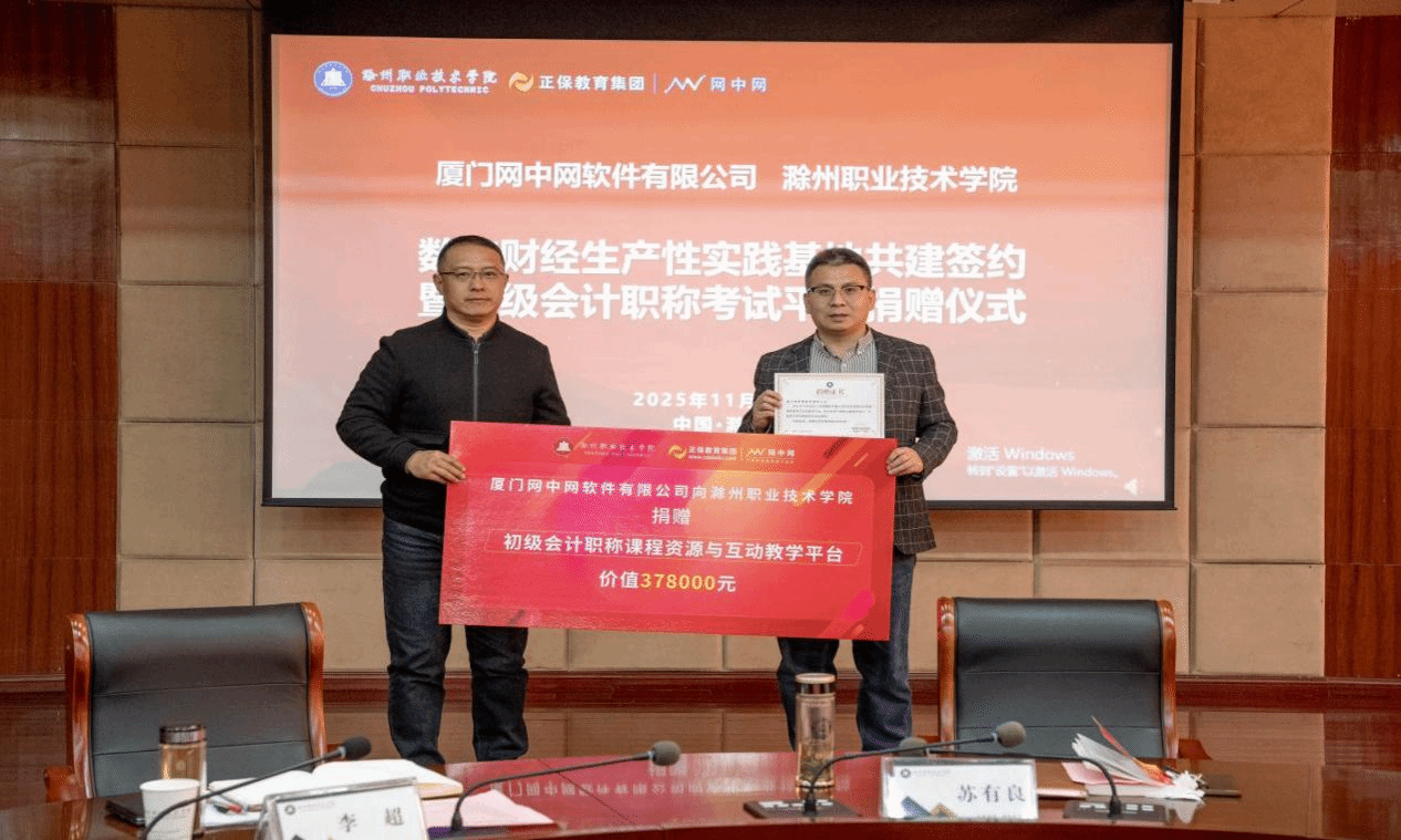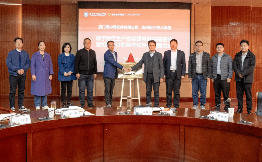 11月19日,滁州职业技术学院管理学院与厦门网中网软件有限公司联合举行“数字财经生产性实践基地”共建签约暨初级会计职称考试平台捐赠仪式。校党委委员、副校长苏有良出席活动并致辞,校党委委员、商学院党总支书记李超、计划财务处处长王蓓蓓、校企合作办公室主任周多道、管理学院党总支书记何文婧、管理学院副院长颜洲,厦门网中网软件有限公司副总裁田久学、院校事业部总经理李邦勇、安徽省区域经理刘家乐、实施经理余智洋及管理学院师生代表参会。