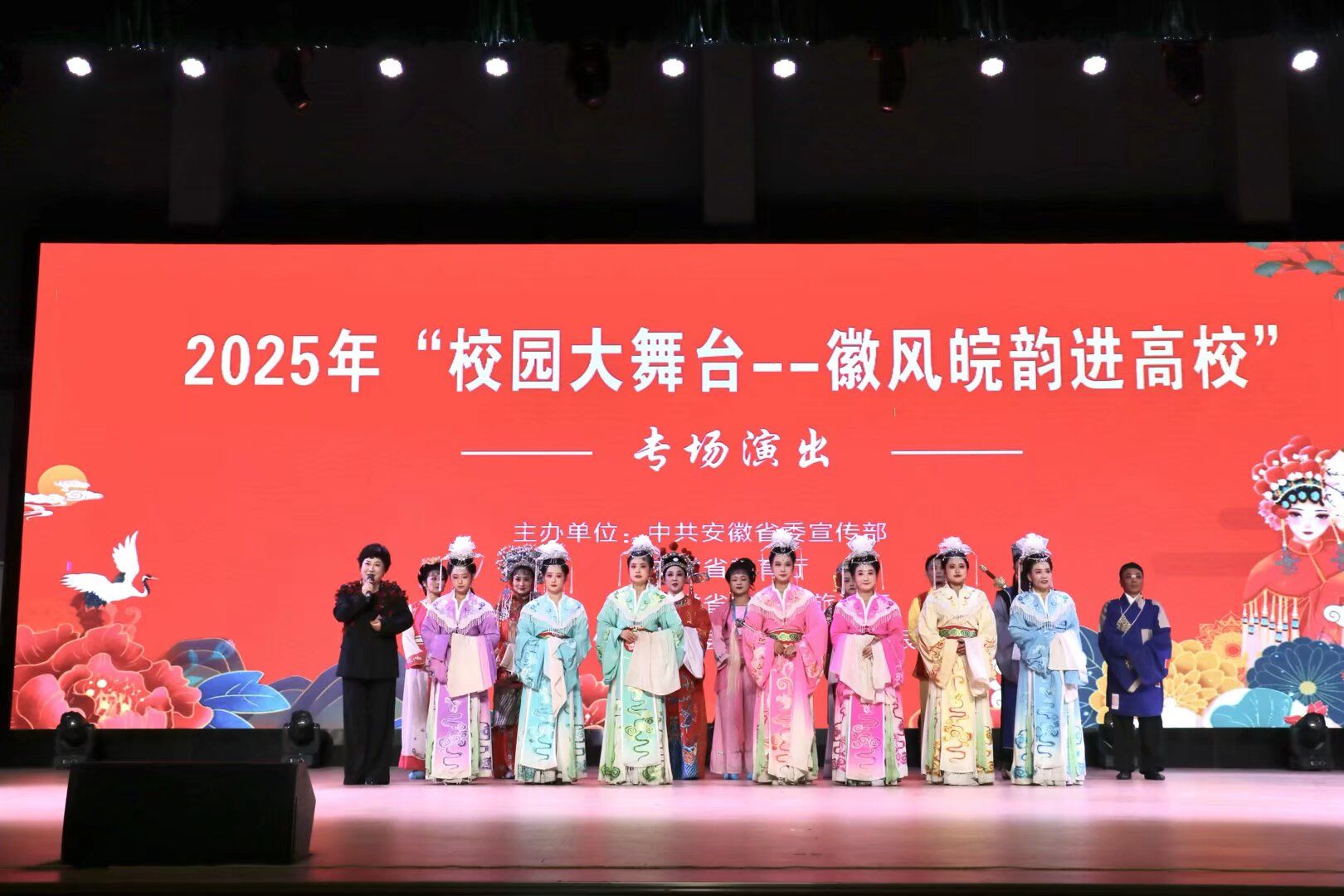 12月2日下午,中共安徽省委宣传部、省教育厅、省文化和旅游厅联合举办的2025“徽风皖韵”进高校活动在我校大礼堂精彩上演。本次活动由安庆市太湖县黄梅戏演艺有限公司倾情演绎,现场800名师生共同观演,活动同步线上直播,让更多师生共赏黄梅戏艺术经典雅韵。