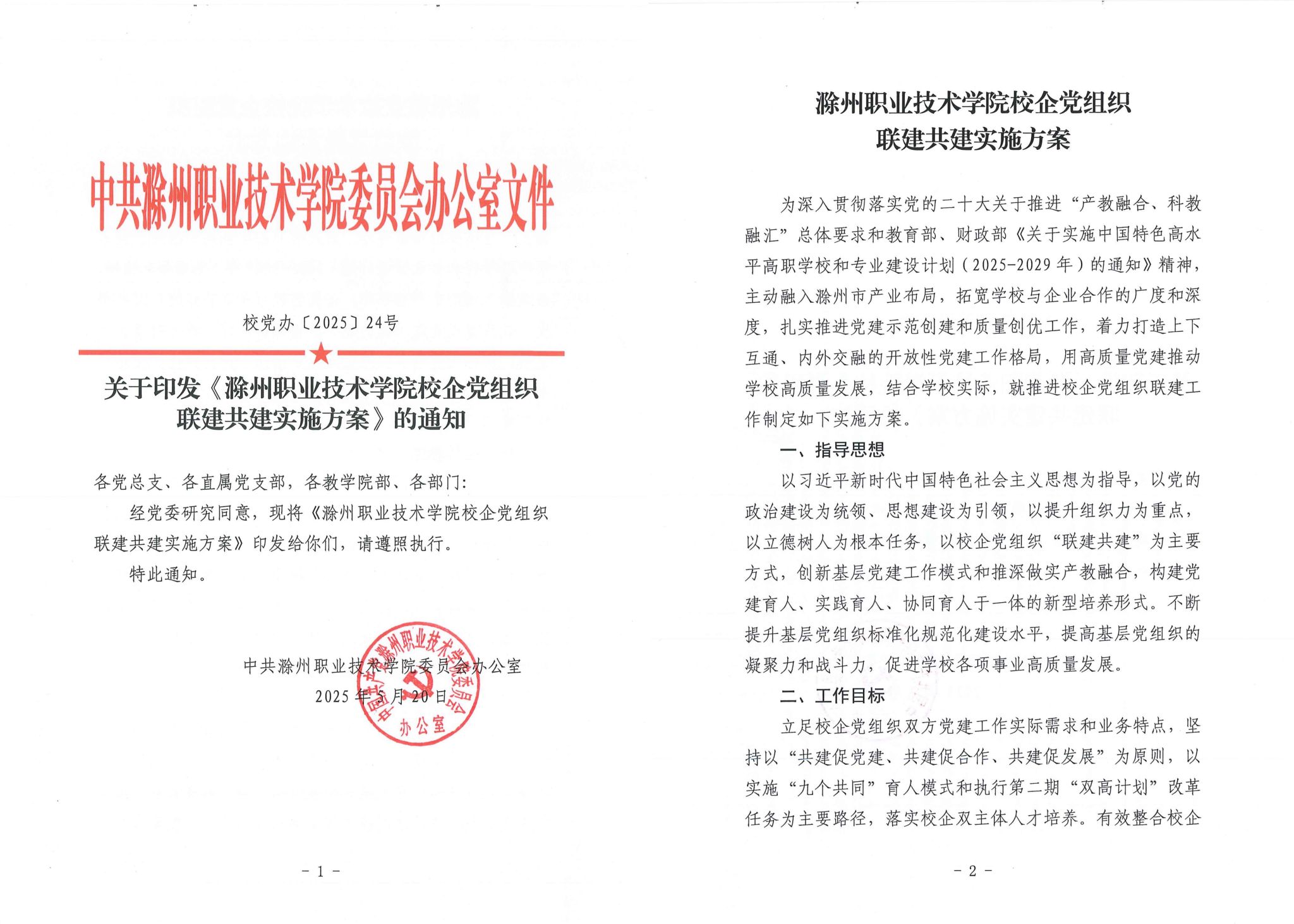学校坚持以习近平新时代中国特色社会主义思想为指导,深入贯彻落实党的二十大关于推进“产教融合、科教融汇”总体要求和教育部、财政部《关于实施中国特色高水平学校和专业建设计划(2025-2029年)的通知》精神,主动融入滁州市产业布局,拓宽校企合作的广度和深度,将开展校企党组织联建共建纳入年度党建工作重点任务和“双高校”建设党建引领重要内容,按照“共建促党建、共建促合作、共建促发展”思路,党委主要负责同志亲自谋划,研究制定《滁州职业技术学院校企党组织联建共建实施方案》,明确共建目标、共建内容、实施步骤和工作要求,成功推动23个党支部与25个企业党支部精准对接、联建共建,实现全校各基层党组织全覆盖。