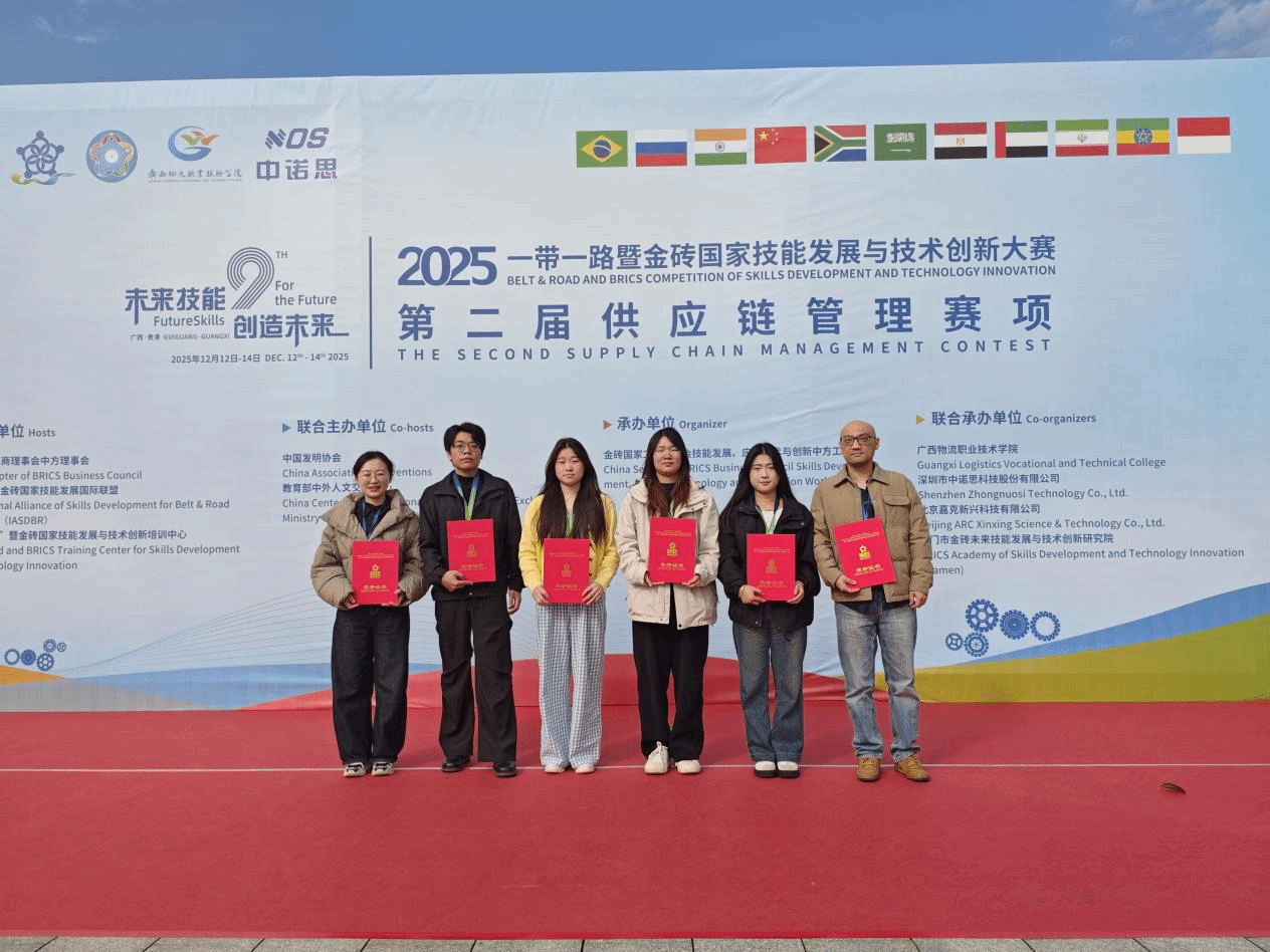 12月12日至15日,由金砖国家技能发展与技术创新大赛组委会主办的第二届供应链管理赛项全国总决赛在广西物流职业技术学院成功举办。我校商学院现代物流管理专业谢天城,王瑞圆,黄思维,陈菲四位同学在全国多支队伍的激烈角逐中脱颖而出,凭借扎实的专业知识和出色的团队协作,斩获二等奖,滁州职业技术学院荣获“优秀组织奖”。