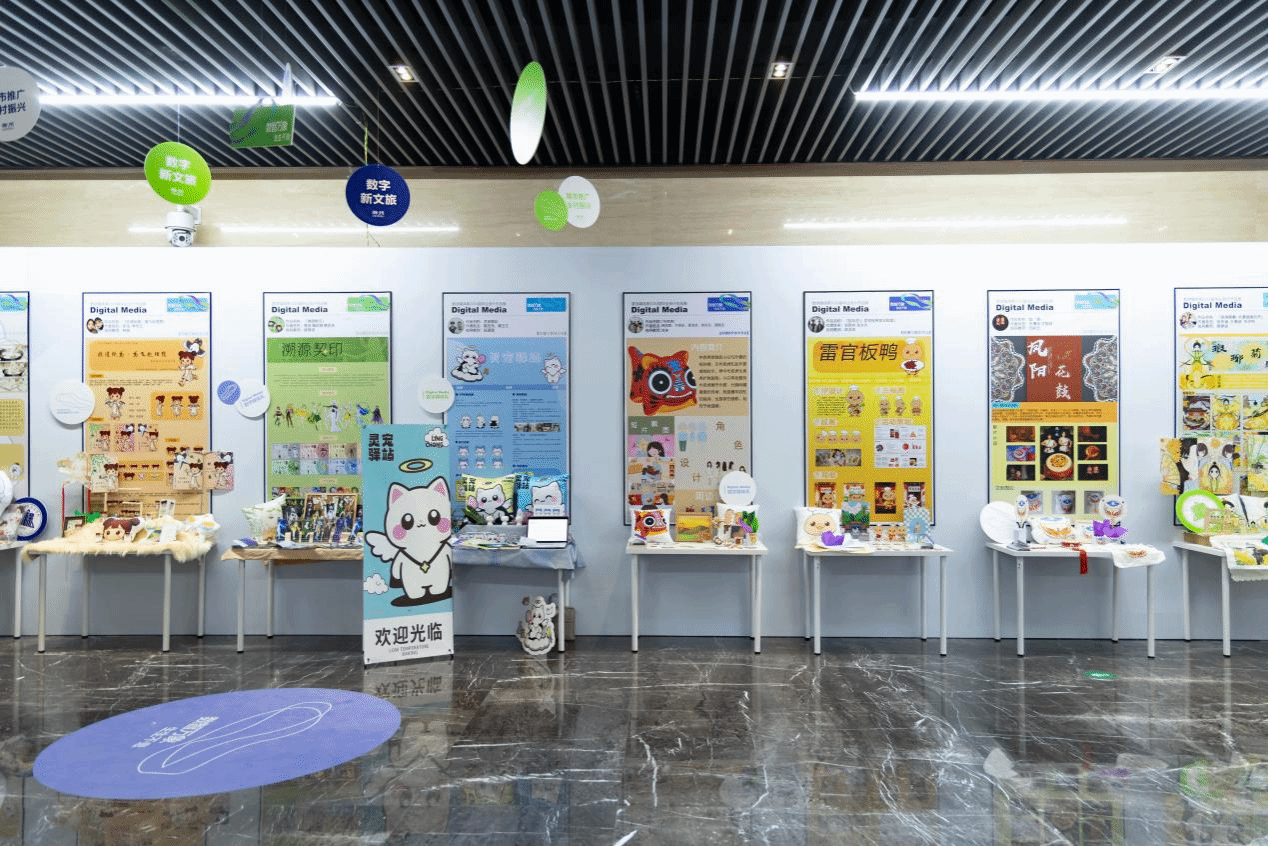 非遗展区以“让传统在数字时代活起来”为旨,实现传统文化从“静态展示”到“动态参与”的转变,为非遗传播提供年轻化、数字化的新范式。“九狮一犼”非遗活化,用十余幅生动插画,细腻描绘狮子守护、嬉戏、舞动等多重形态,巧妙串联南谯大地上的自然风貌与深厚的民间舞狮传统;《福运传承》创新融合二维动画与传统剪纸艺术,细腻呈现祖孙日常与福运传承的坚守,以“福字倒贴”的经典传说,讲述文化的代代相传,勾勒出民俗与温情;《双条鼓响·潮启非遗》提取拨浪鼓、传统服饰纹样等非遗符号,重塑凤阳花鼓文化传播路径,作品融合“非遗+科技”,打造线上动态数字藏品与线下智能文创周边。既保留非遗文化的情感内核,又通过科技手段打破场景边界。