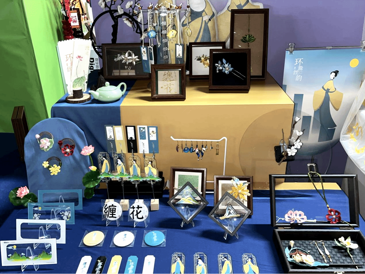 根植于地方文化,策划新生活品牌。“亭城二十四”展位将中国二十四节气色彩美学与古法草木染技艺深度融合,以滁州当地172种自然与人文元素为基础,提取出87个最具地方特质的符号体系,以二十四节气为色彩脉络,精心制作二十四景不同的草木染作品,每一件作品都承载着时节流转与在地风物。“环滁丝韵”提炼滁州地域文化精髓,使用非遗缠花技艺,选取山形轮廓、亭台飞檐、云雾线条等滁州美景小品,制作系列伴手礼。展位前设立缠花现场教学体验区,观展者频频驻足、热烈互动。