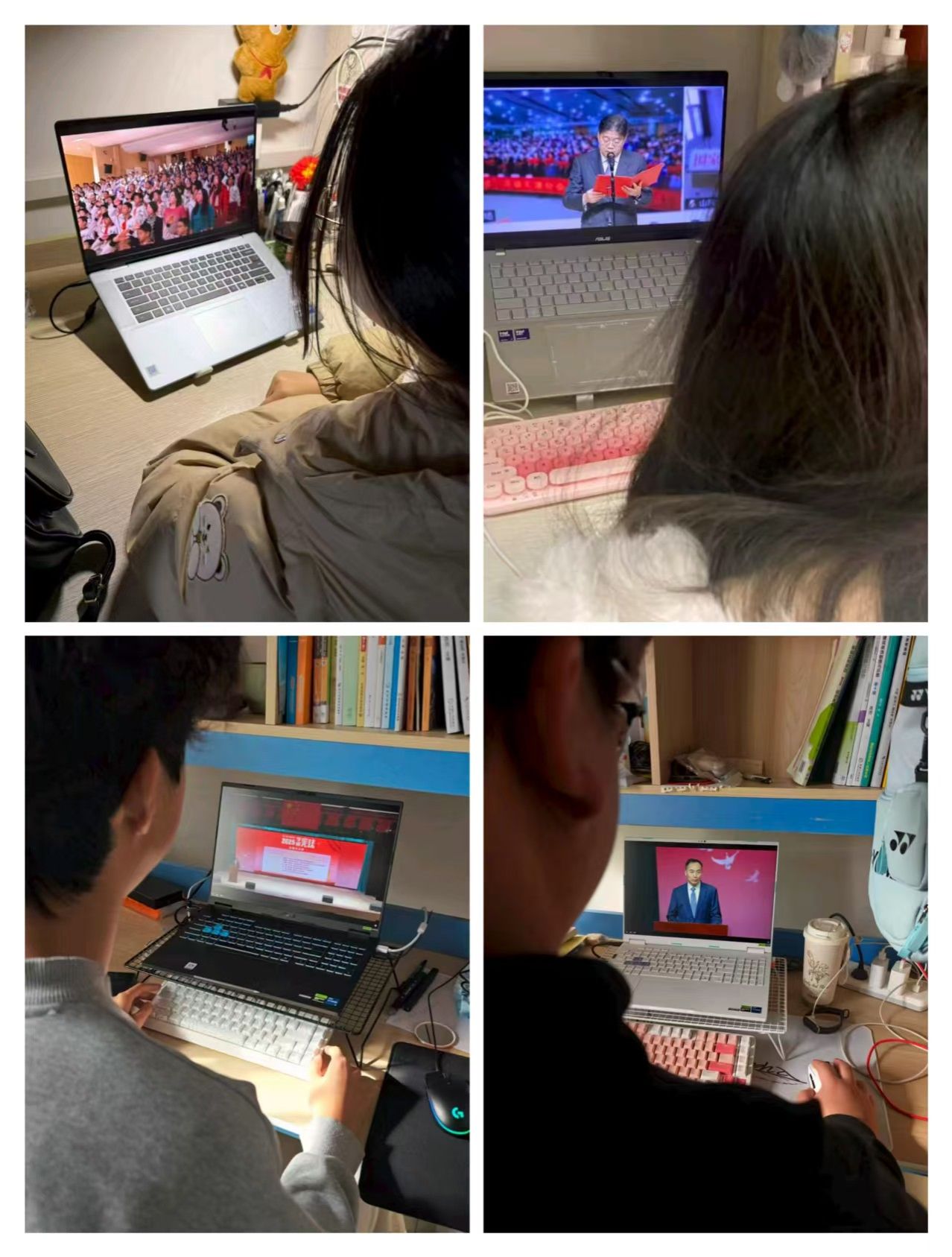 学生在宿舍内自发组建“线上学习小组”,通过电脑、手机等设备同步接入直播。宿舍里,同学们认真聆听讲解、专注跟读条文,形成了“一人带动一室、一室影响一片”的良好学习氛围。尽管学习场景不同,但大家的学习热情丝毫不减,共同在晨光中接受宪法的滋养与熏陶。