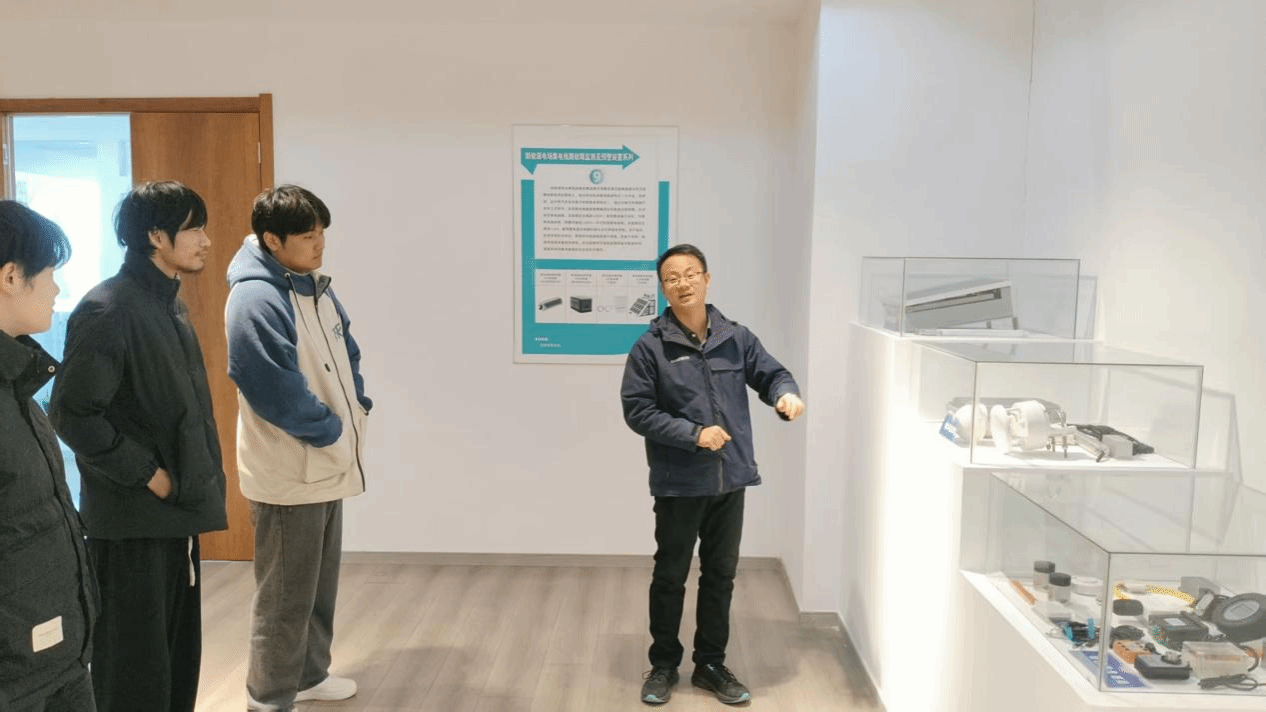 严合群教授委派蔡经理,带领电子信息系师生共同参观企业展厅,了解企业文化,深入学习高压电缆故障预警与精确定位装置、输电线路云台微拍在线监测装置、主动式及早期火灾监测预警装置和地质灾害监测装置等产品信息。